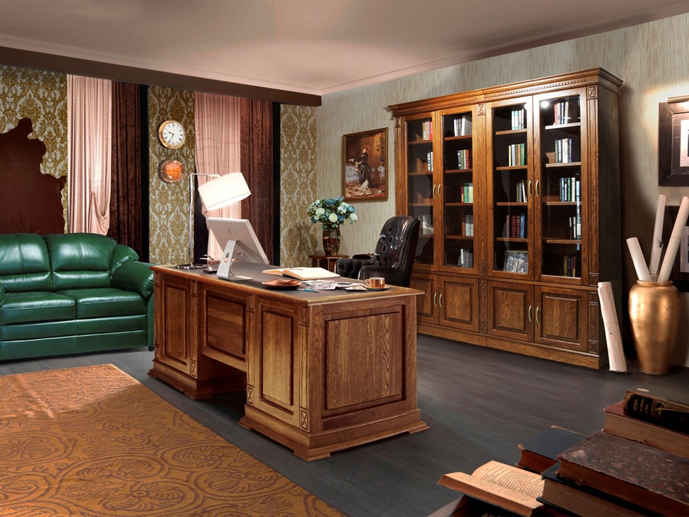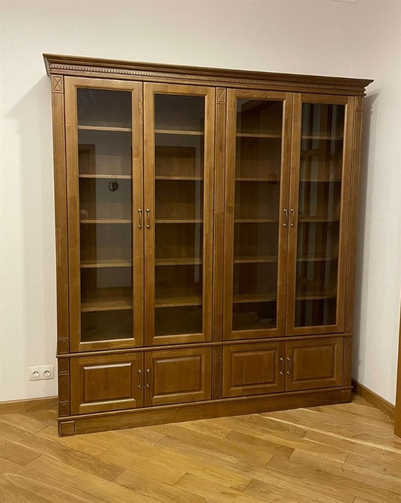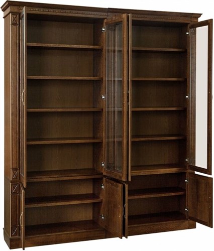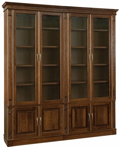 Библиотека 4-х дверная Флоренция - элитная мебель первоклассного качества исполнения для дома или офиса. Представленный образец добавит респектабельности Вашему имиджу, сделает интерьер комнаты стильным и максимально обустроенным. Верхний ярус модели представлен четырьмя распахивающимися застекленными дверками, за которыми скрыты деревянные полки. Стеклянные фасады защитят все, что можно доверить модулю: книги, коллекции, альбомы воспоминаний, увлечения и пр. Нижняя часть конструкции имеет отделы за глухими дверьми.