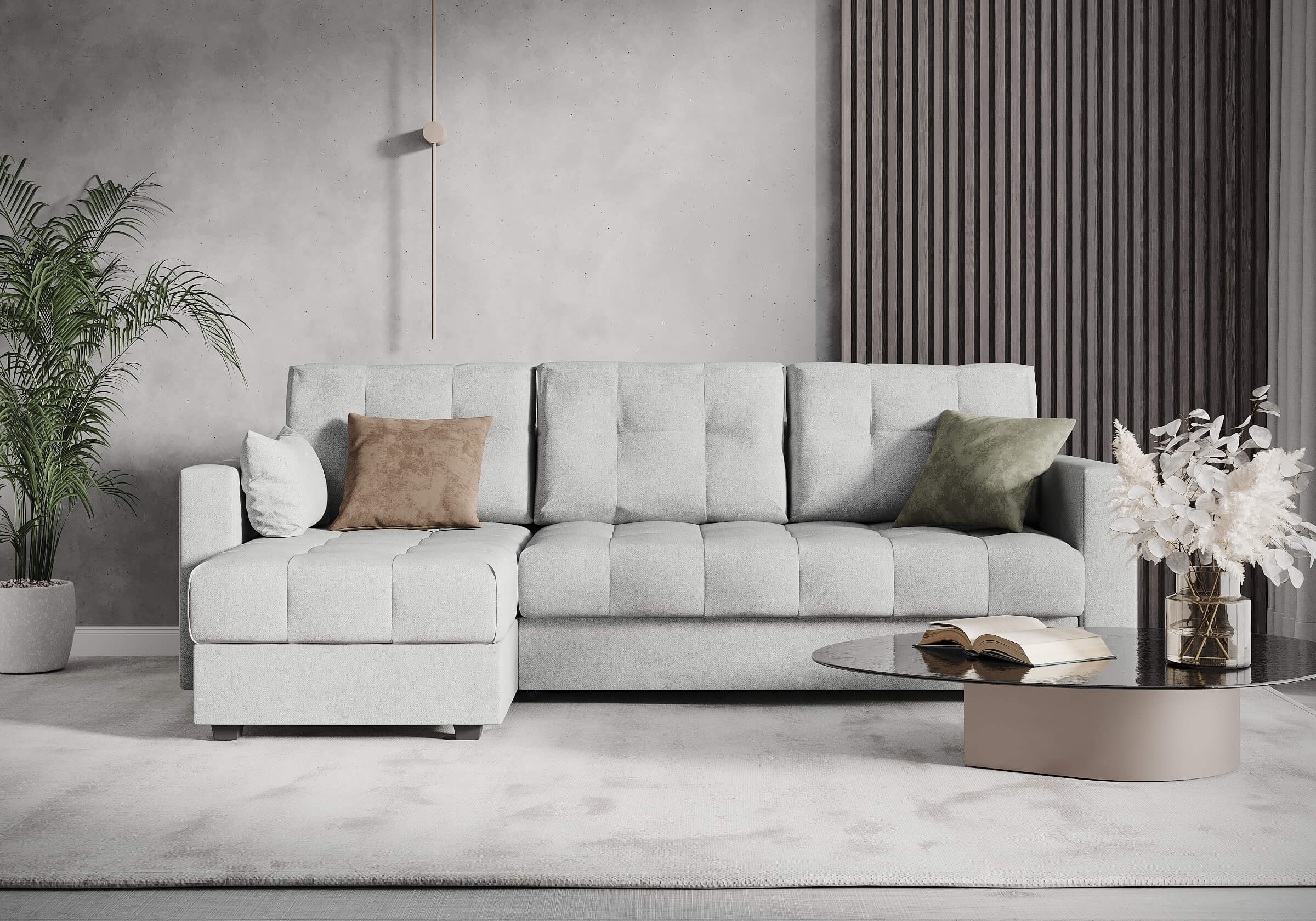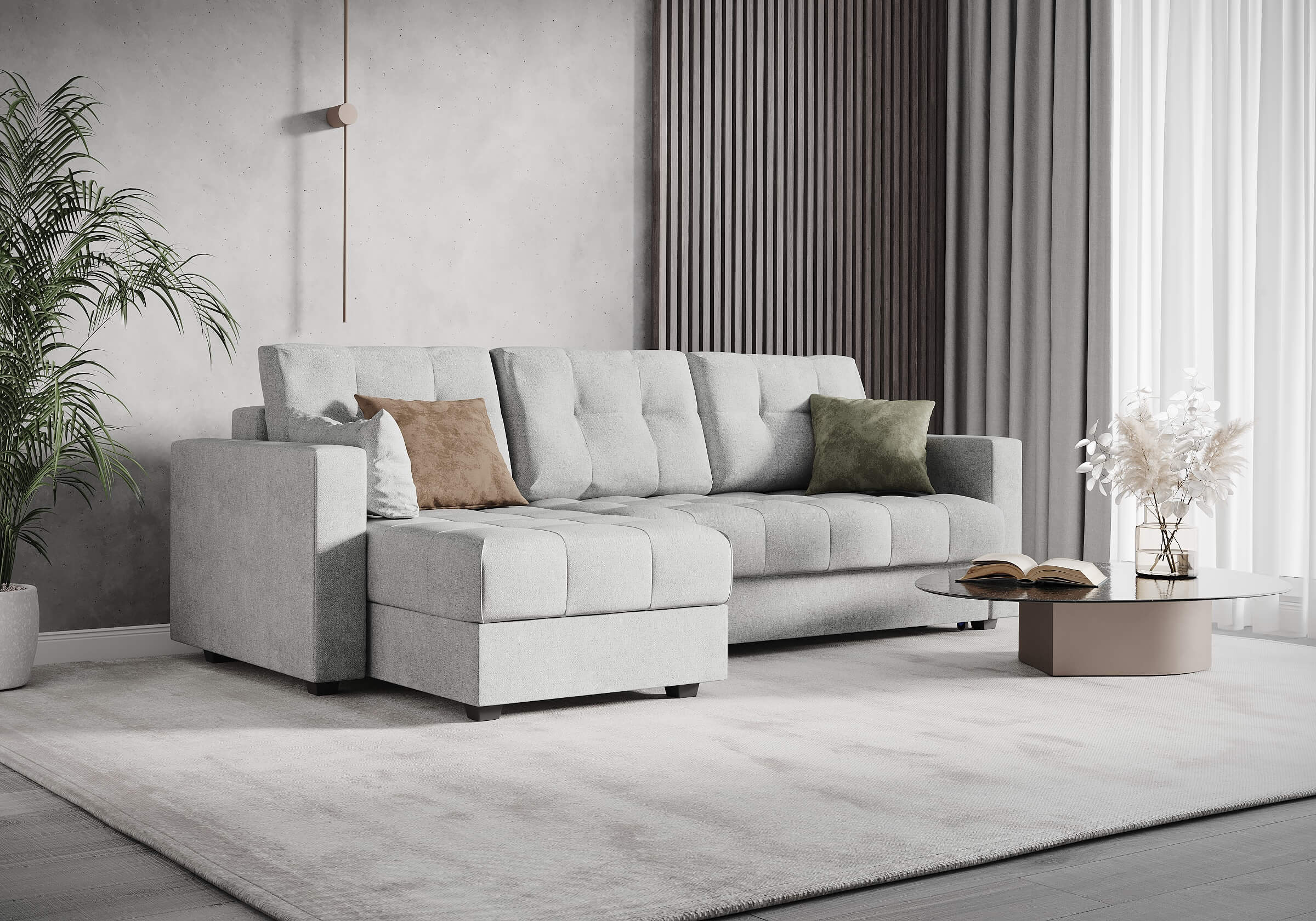 Современный и комфортный диван с механизмом трансформации "еврокнижка". Этот диван станет отличным выбором для дома, сочетая в себе стиль, функциональность и удобство. Диван имеет угловую конфигурацию, что позволяет ему идеально вписаться в любой интерьер. Угловая секция, или оттоманка, устанавливается как справа, так и слева, в зависимости от предпочтений и особенностей планировки комнаты, делая диван универсальным решением для любого пространства. Модель оснащена вместительным бельевым коробом, что позволяет эффективно использовать пространство и хранить постельные принадлежности или другие вещи. Матрас средней жесткости обеспечивает оптимальную поддержку и комфорт во время сна, что важно для ежедневного использования. Задняя спинка дивана защищает от прикосновения со стеной, предотвращая возможные повреждения и загрязнения. В комплект дивана входит декоративная подушка размером 30x50 см, которая добавляет уют и завершает образ интерьера.