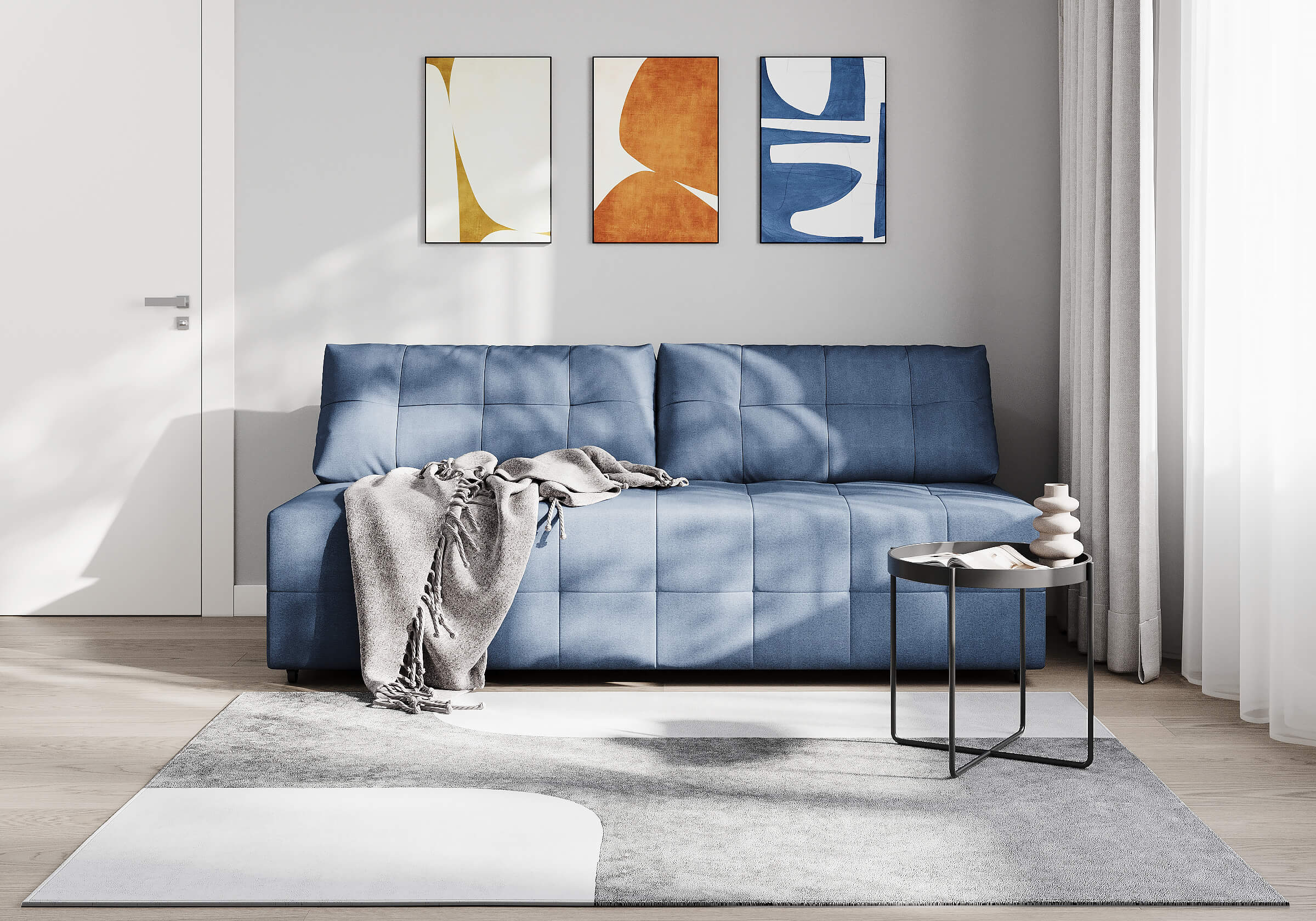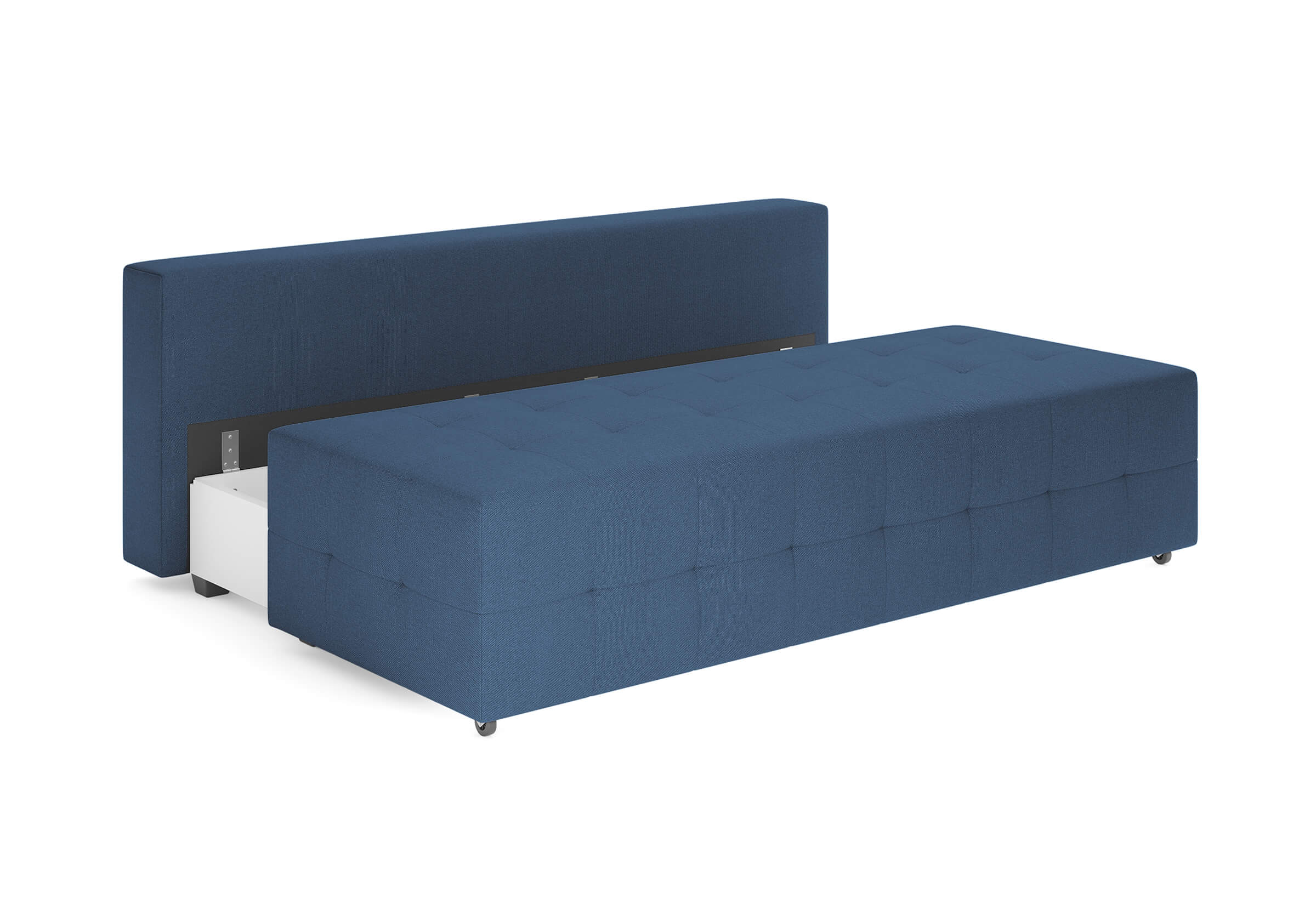 Диван в современном стиле без подлокотников с механизмом трансформации еврокнижка и коробом для хранения. Благодаря объемной стежке в форме квадратов, отсутствию подлокотников и минимальным габаритам диван подойдет для активного городского жителя. Матрас анатомический с независимым пружинным блоком обеспечит комфортное спальное место. В основе мягких подушек – микс наполнителей: поролоновая крошка не дает деформироваться, а синтетическое волокно добавляет комфорт.