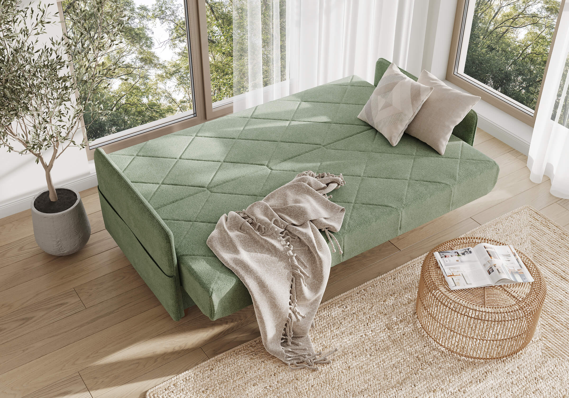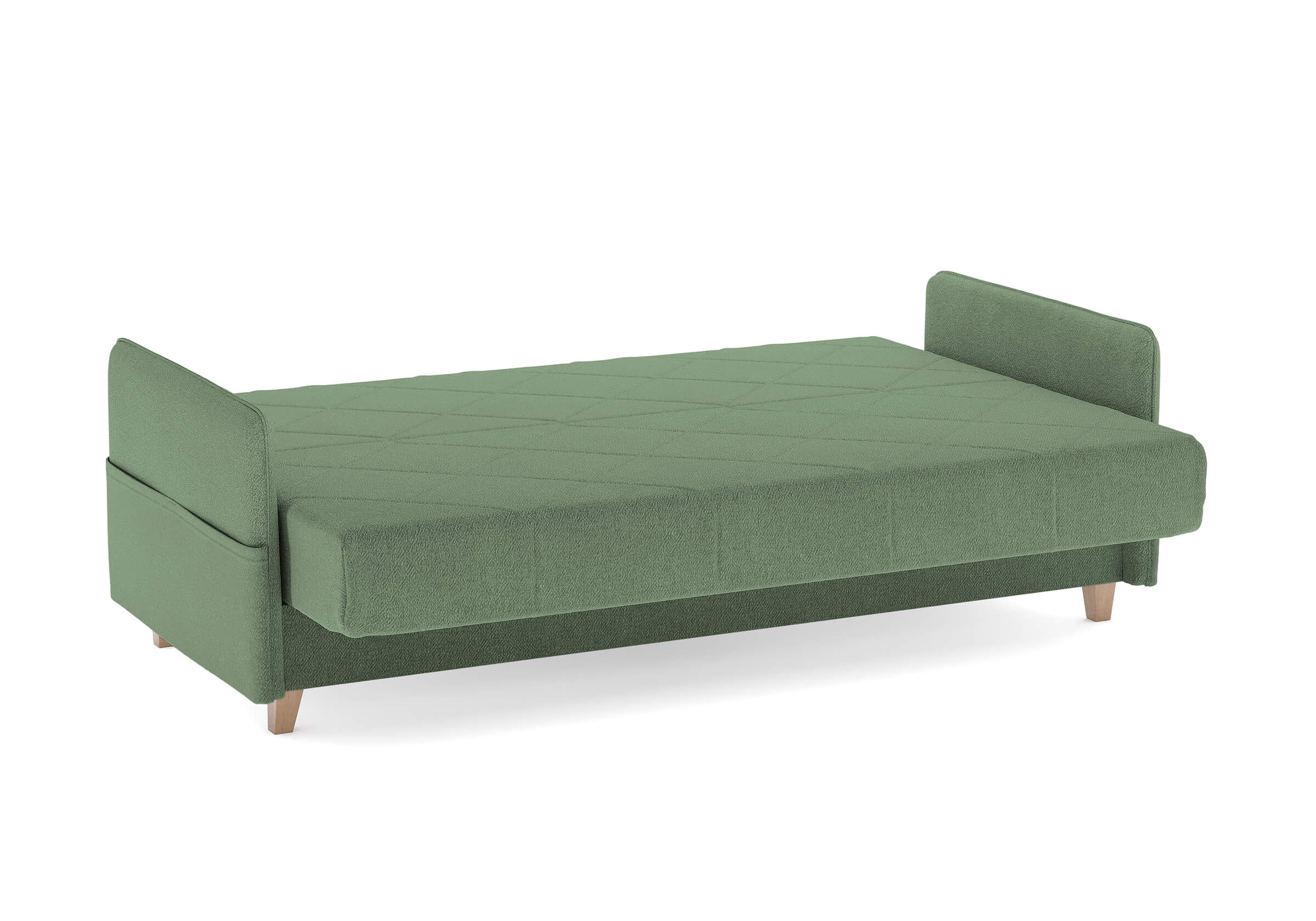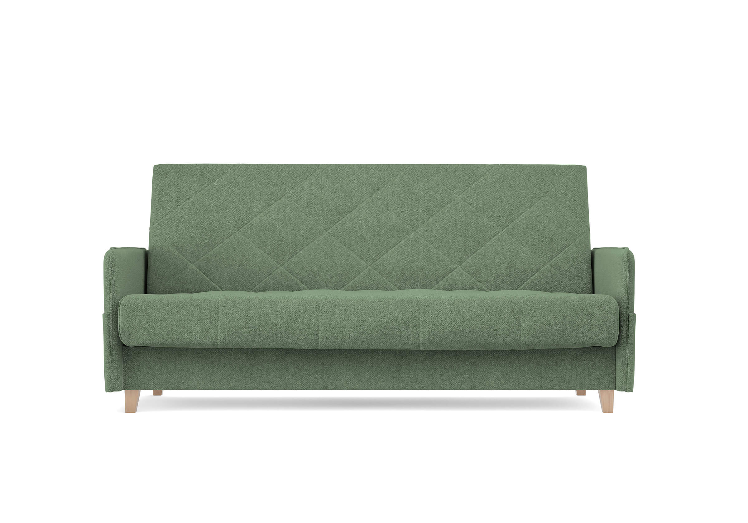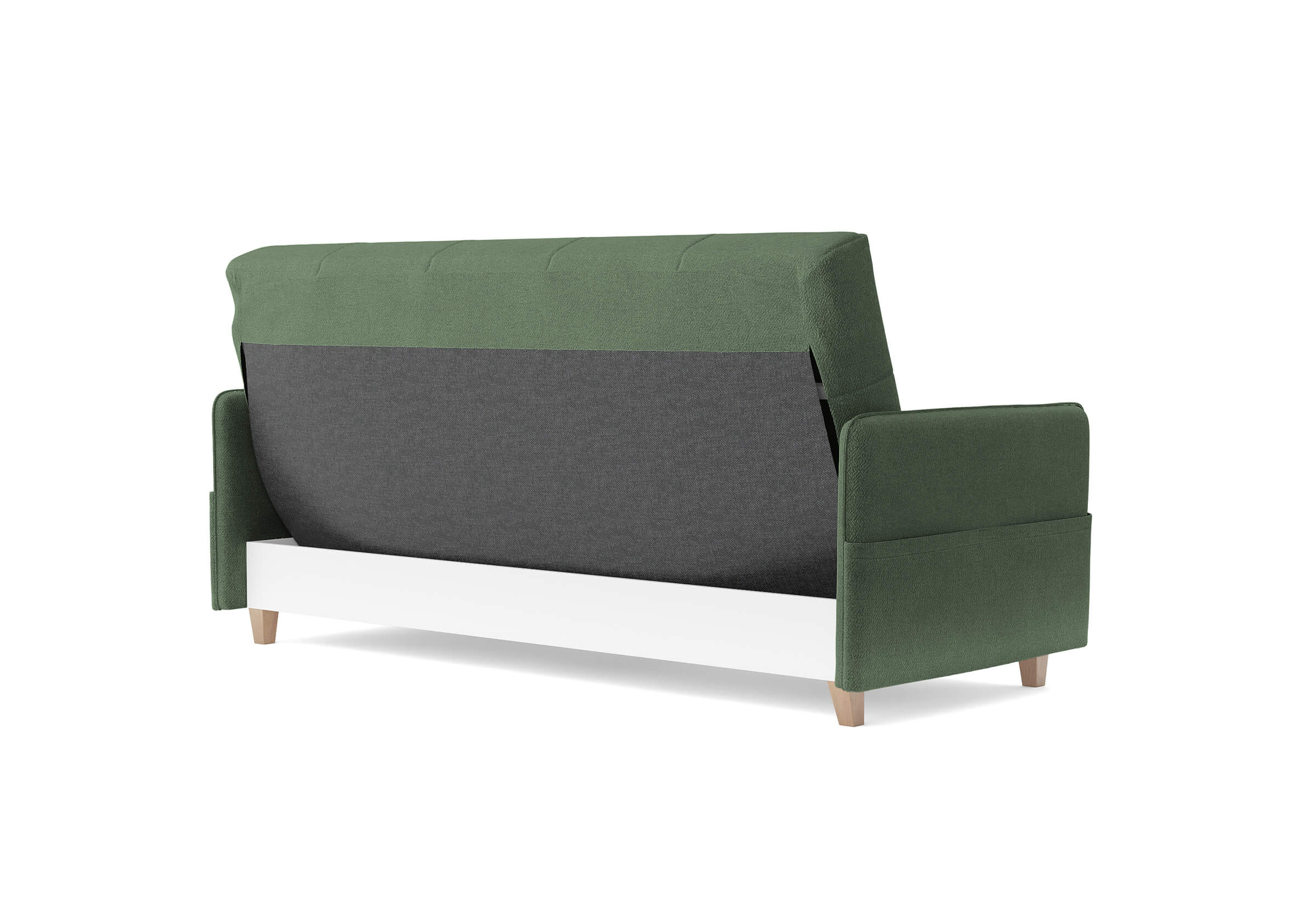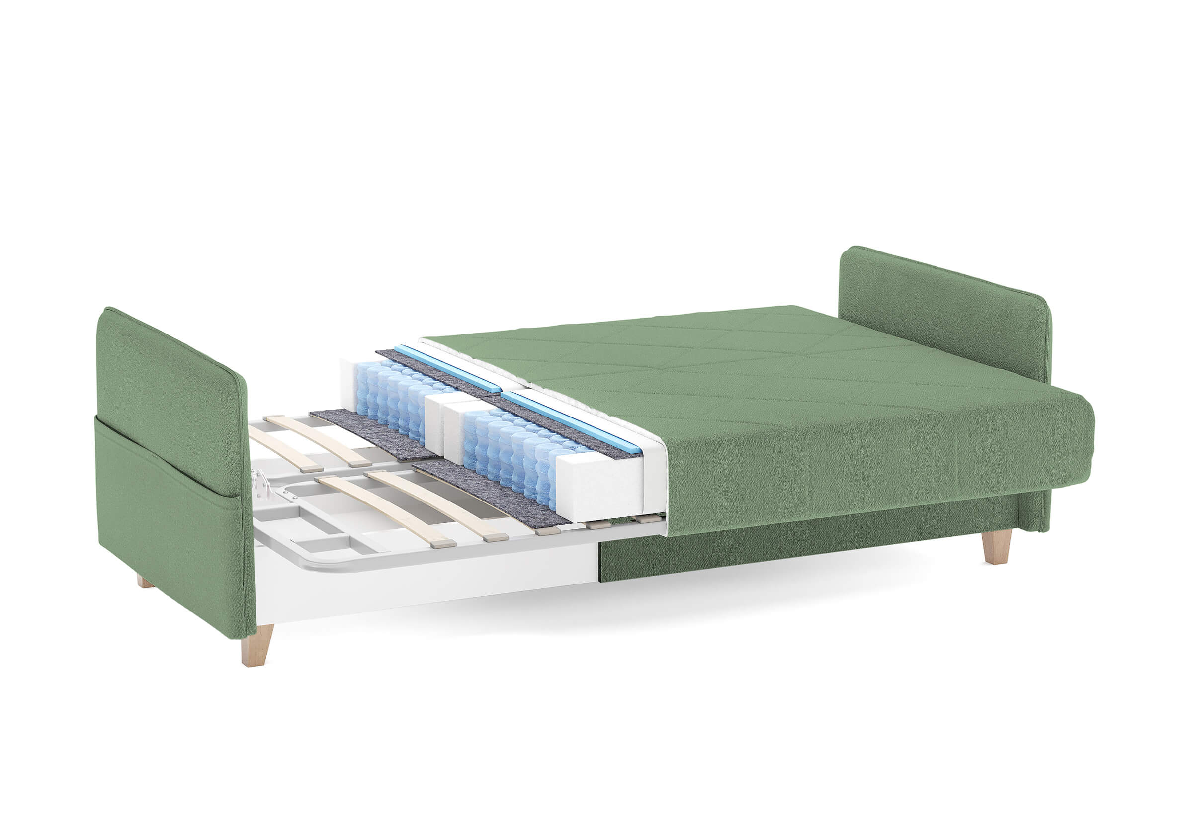 Диван Forest - современный функциональный диван-кровать для сна и отдыха в скандинавском стиле с механизмом трансформации «клик-кляк» и коробом для хранения. Основа дивана - металлическое основание с ортопедическими ламелями и анатомический матрас с независимым пружинным блоком. Благодаря съемному чехлу с объемной стежкой в форме ромбов, диван органично впишется в современные интерьеры в скандинавском стиле и стиле минимализм. Благодаря тонким подлокотникам у дивана минимальные габариты как в сложенном, так и разложенном виде. Широкие карманы-органайзеры на подлокотниках позволяют хранить в доступе необходимые вещи. Диван Forest оборудован вместительным коробом для хранения постельного белья или аксессуаров для сна. Опоры деревянные, натурального цвета, просвет над полом способствует легкой уборке под диваном, в том числе роботом-пылесосом. Короб для хранения из белого ЛДСП без разделения на секции дает возможность для хранения негабаритных вещей. Глубина короба 16 см является достаточной для комфортного хранения аксессуаров для сна и прочих вещей.