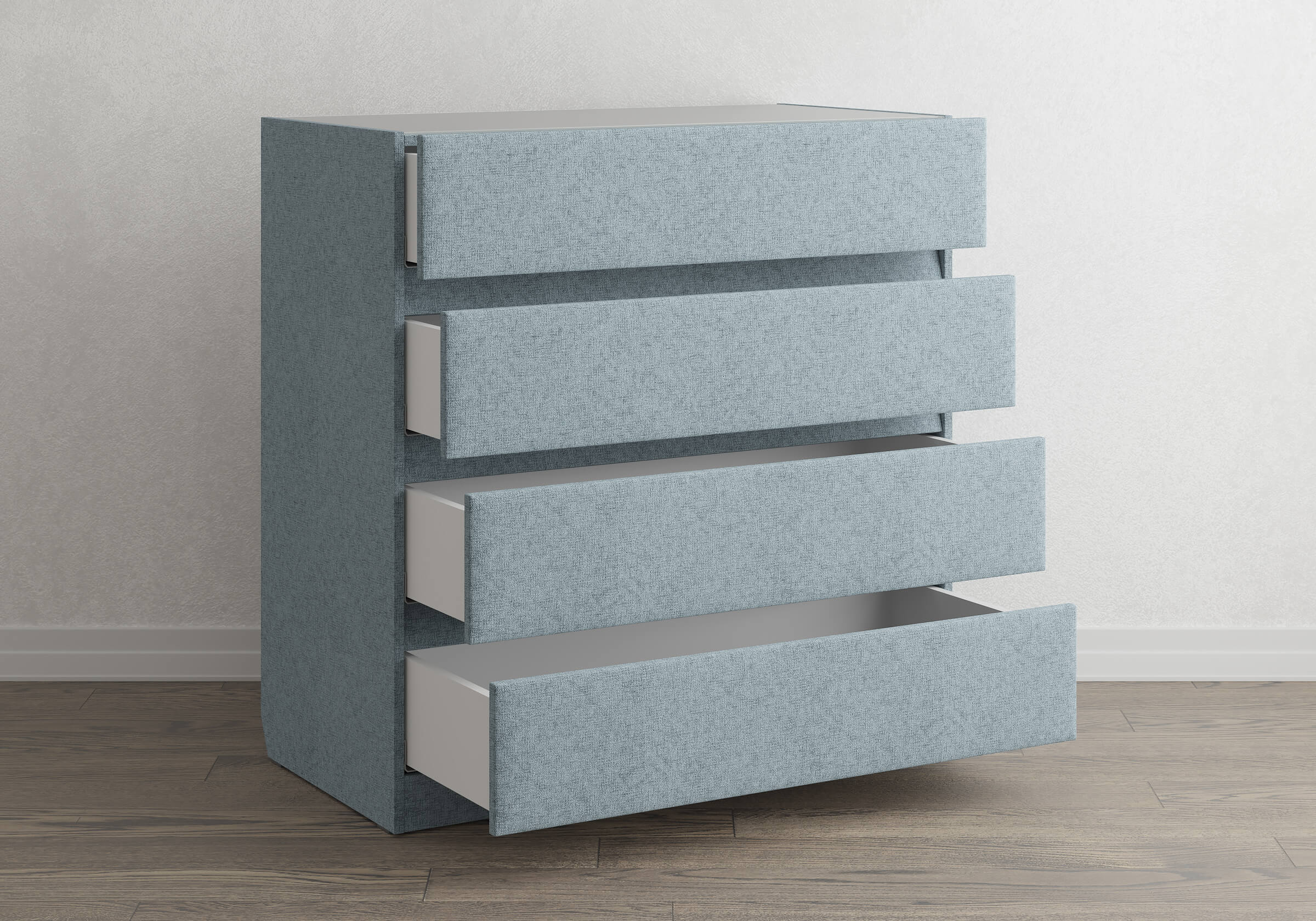 Комод Omega выполнен в современном стиле. Прямые линии, отсутствие ручек и просвета от пола, делают его универсальным, позволяя комплектовать комод с тумбами Omega и кроватями, имеющими лаконичное изголовье. Четыре выдвижных ящика с направляющими скрытого монтажа оснащены доводчиками. Задняя стенка выполнена из ДСП и обита спанбондом, это делает комод устойчивым и прочным. Комод Omega имеет скос под плинтус, это позволяет устанавливать его вплотную к стене. Можно укомплектовать стеклянной столешницей. Широкий выбор фактур и цветов исполнения.