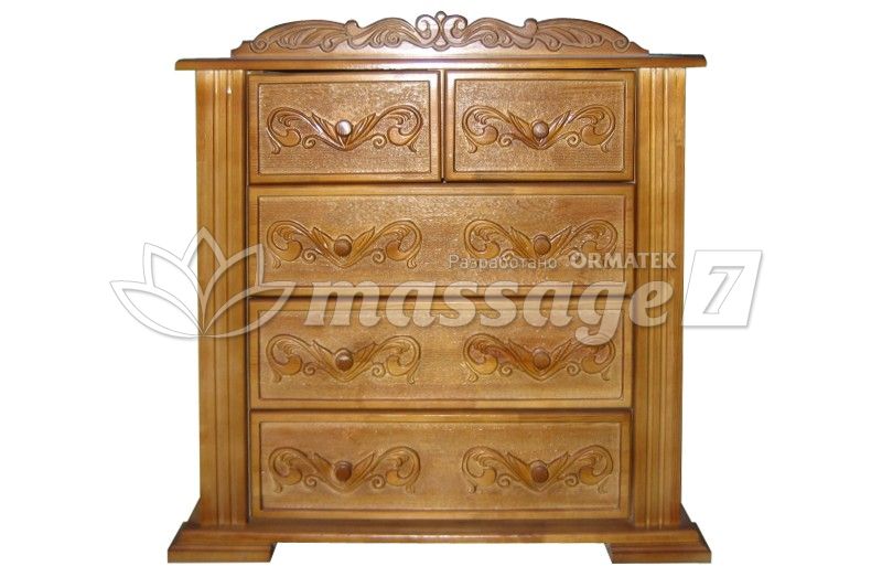 Комод резной классического стиля с выдвижными ящиками. Вместимость ящиков достаточно большая, для того, чтобы туда поместилось белье, предметы обихода и различная «мелочевка». Общая стилистика комода — сказочная, благодаря резным рисункам. Возможно изготовление по индивидуальным размерам.