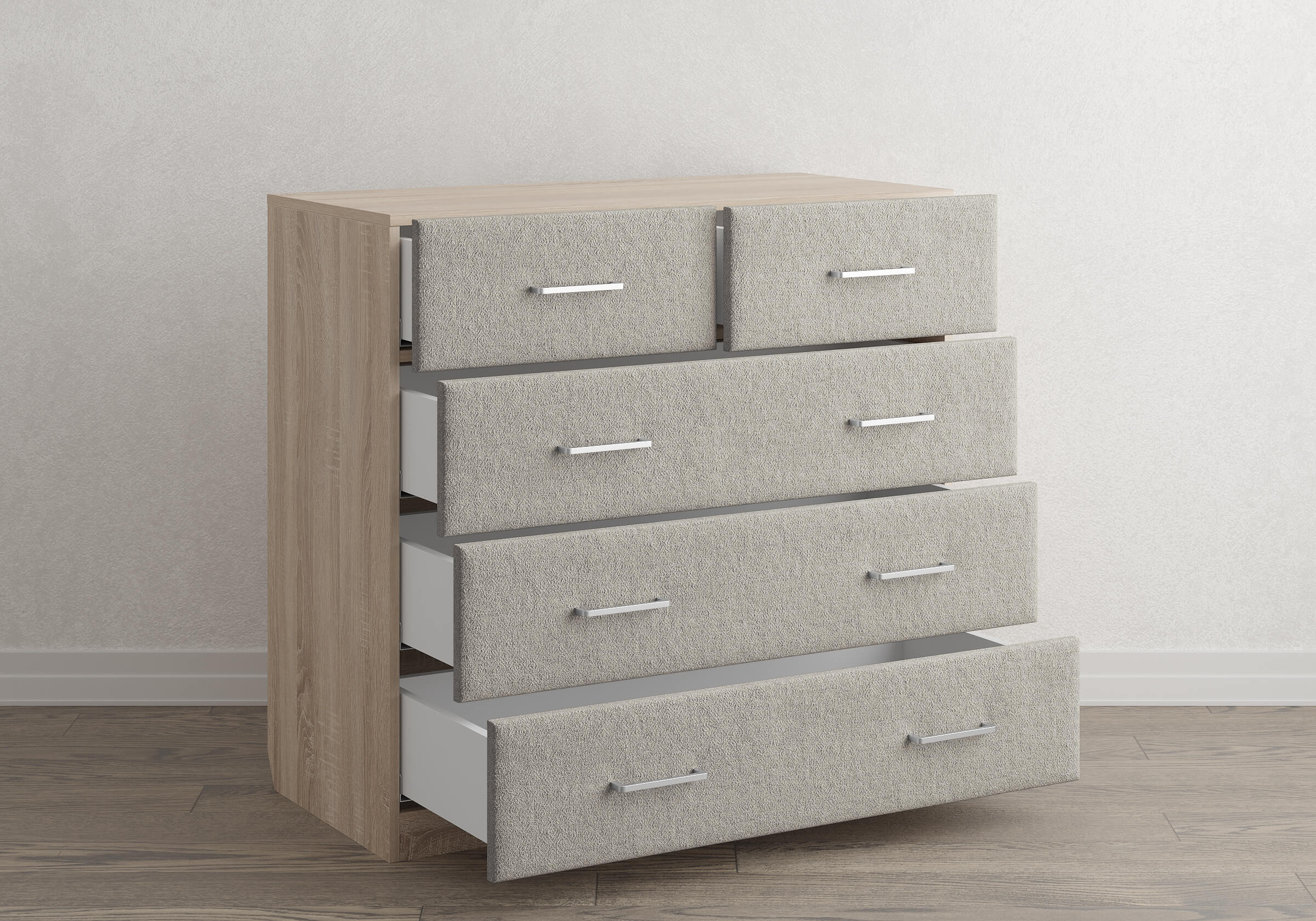 Комбинированный комод Tomas с пятью вместительными ящиками станет элегантным дополнением интерьера. Корпус, выполненный из высококачественной ЛДСП, гарантирует прочность и долговечность, а мягкие фасады в ткани и изящные металлические ручки добавят уют. Комод имеет скос под плинтус, это позволяет устанавливать его вплотную к стене. Благодаря своему дизайну и широкому выбору вариантов исполнения комод можно разместить не только в спальне, но и в прихожей или гостиной.