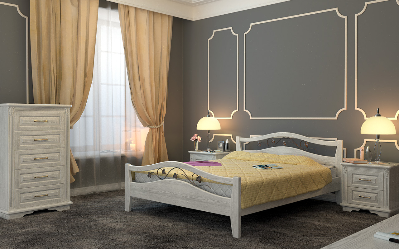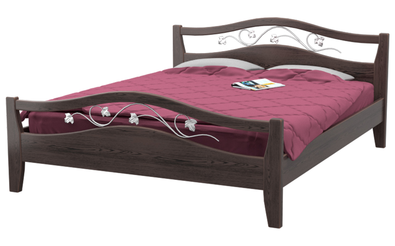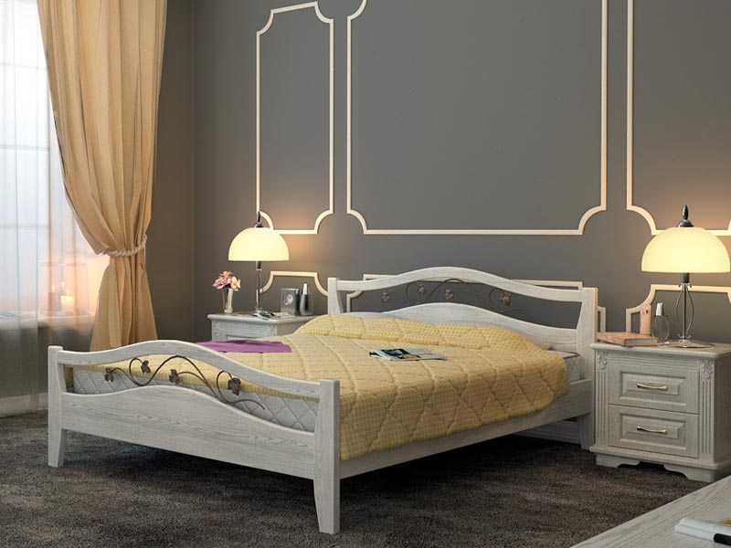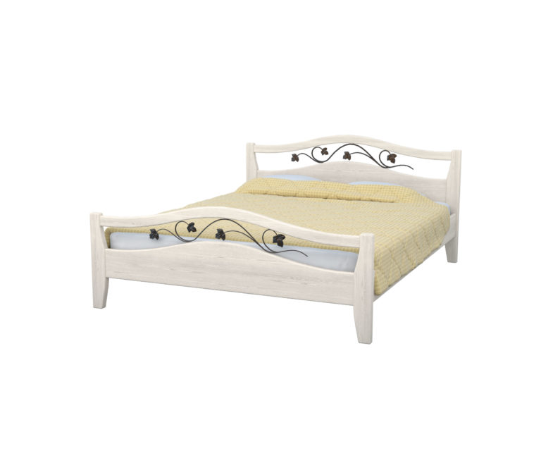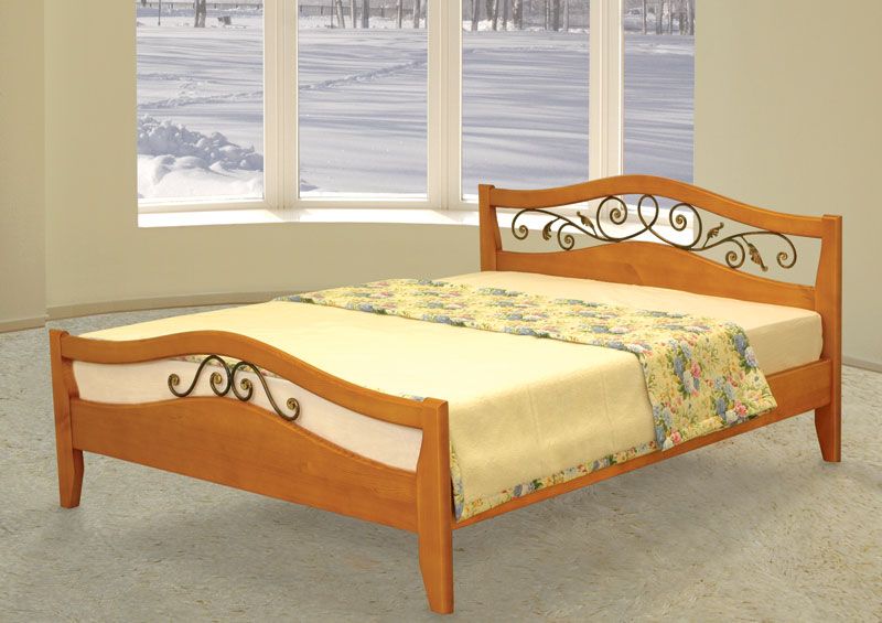 Изготовленная из массива сосны кровать «Алиса» (ковка) имеет красивый классический дизайн и конструкцию. Благодаря элементам ковки присутствующим на передней и задней спинке кровати, ее дизайн становиться более изысканным и уникальным. Ковка выполнена из тонких металлических трубок, которые имеют плавно переходящие завитки с элементами кованых лепестков. Ковка имеет контрастный темный цвет со светлым цветом древесины кровати. Также на ковке присутствуют элементы покраски в золотом цвете. Кроме того, за счет достаточно высоких ножек, у вас появляется дополнительное пространство под кроватью, которое можно также использовать с определенной целью.