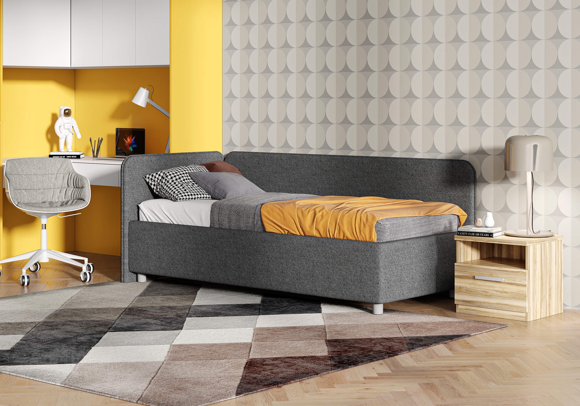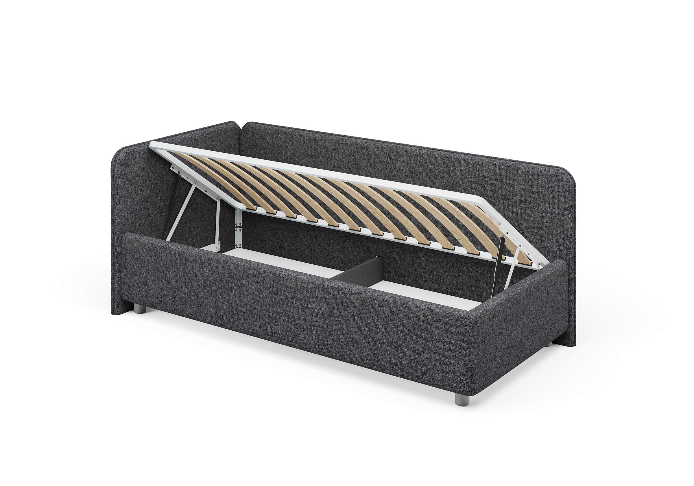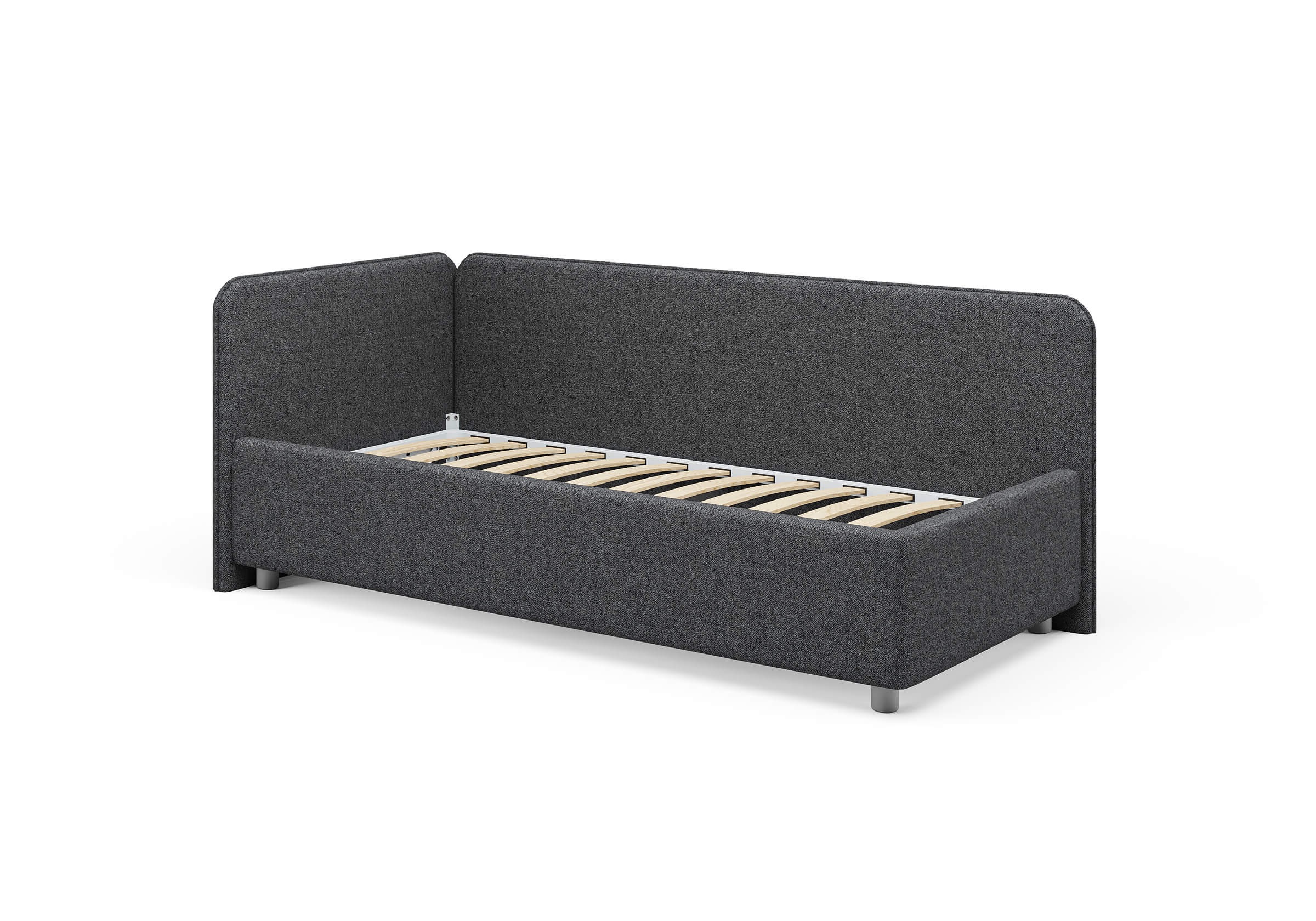 • Односпальная кровать в современном стиле. Кровать-софа с одной боковой спинкой. Идеально подходит для квартир с небольшой площадью, детских и подростковых спален, гостевых комнат. Боковую спинку кровати можно изготовить на выбор на правую или левую сторону. Модель изготовлена из ДСП. Дополнительно можно выбрать ортопедическое основание или укомплектовать кровать подъемным механизмом с бельевым ящиком. Каркас основания выполнен из металла, ламели - из берёзы.