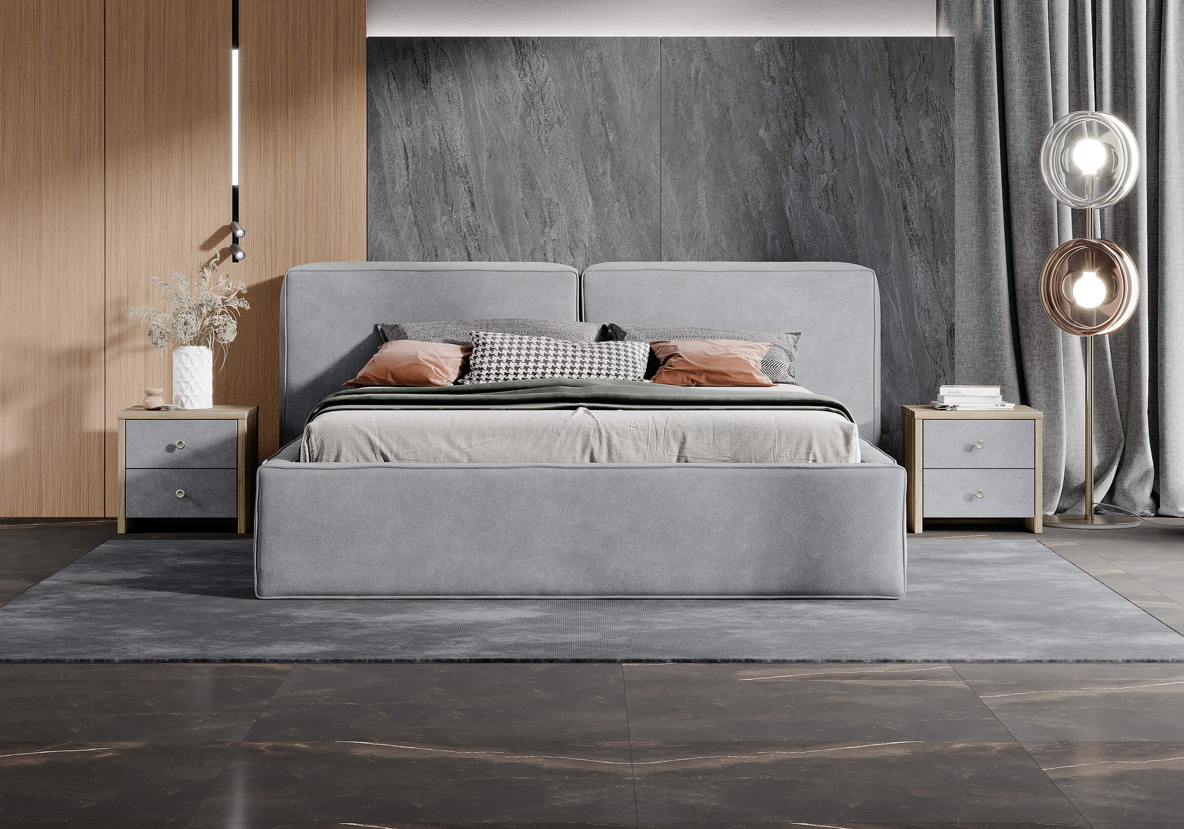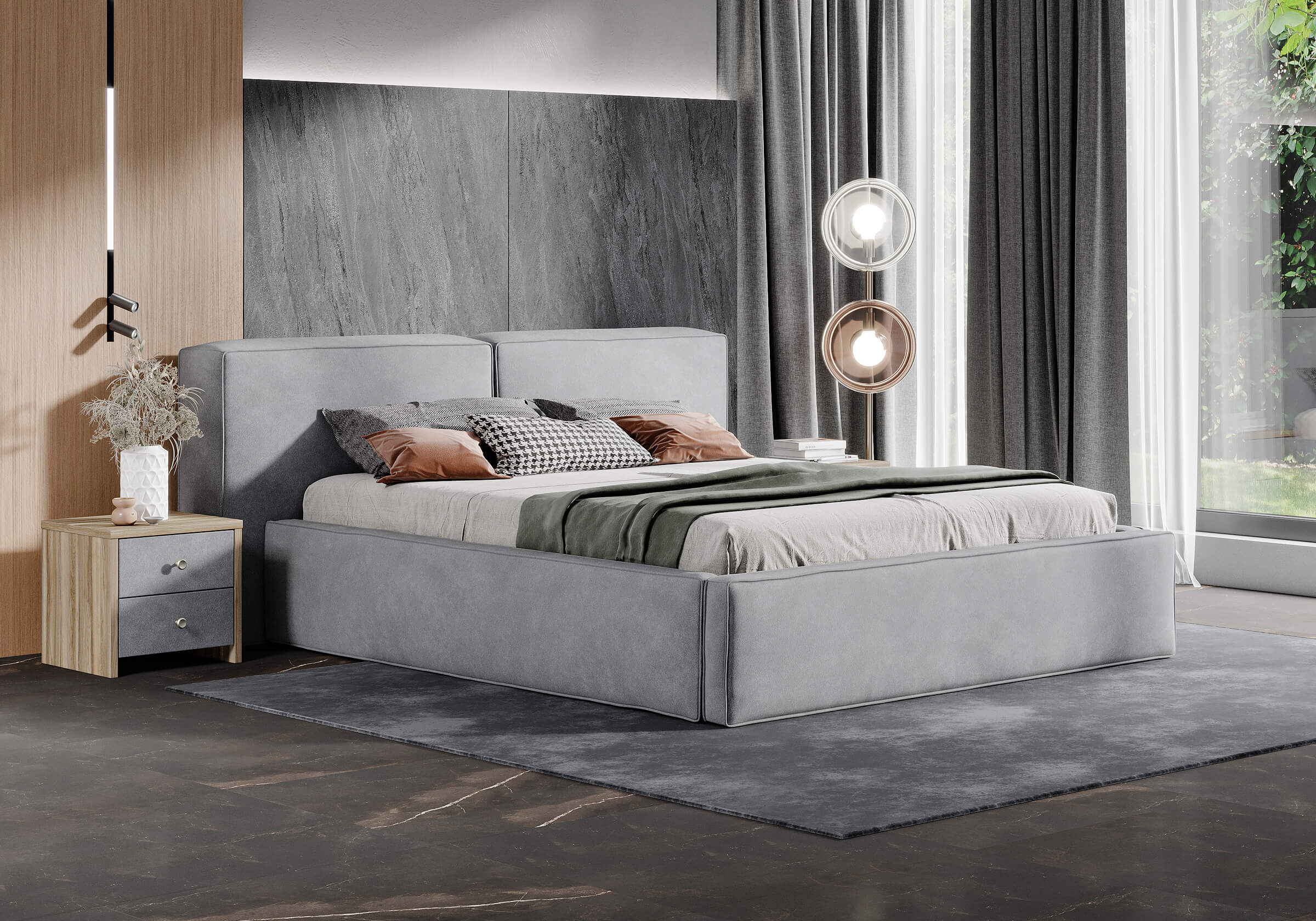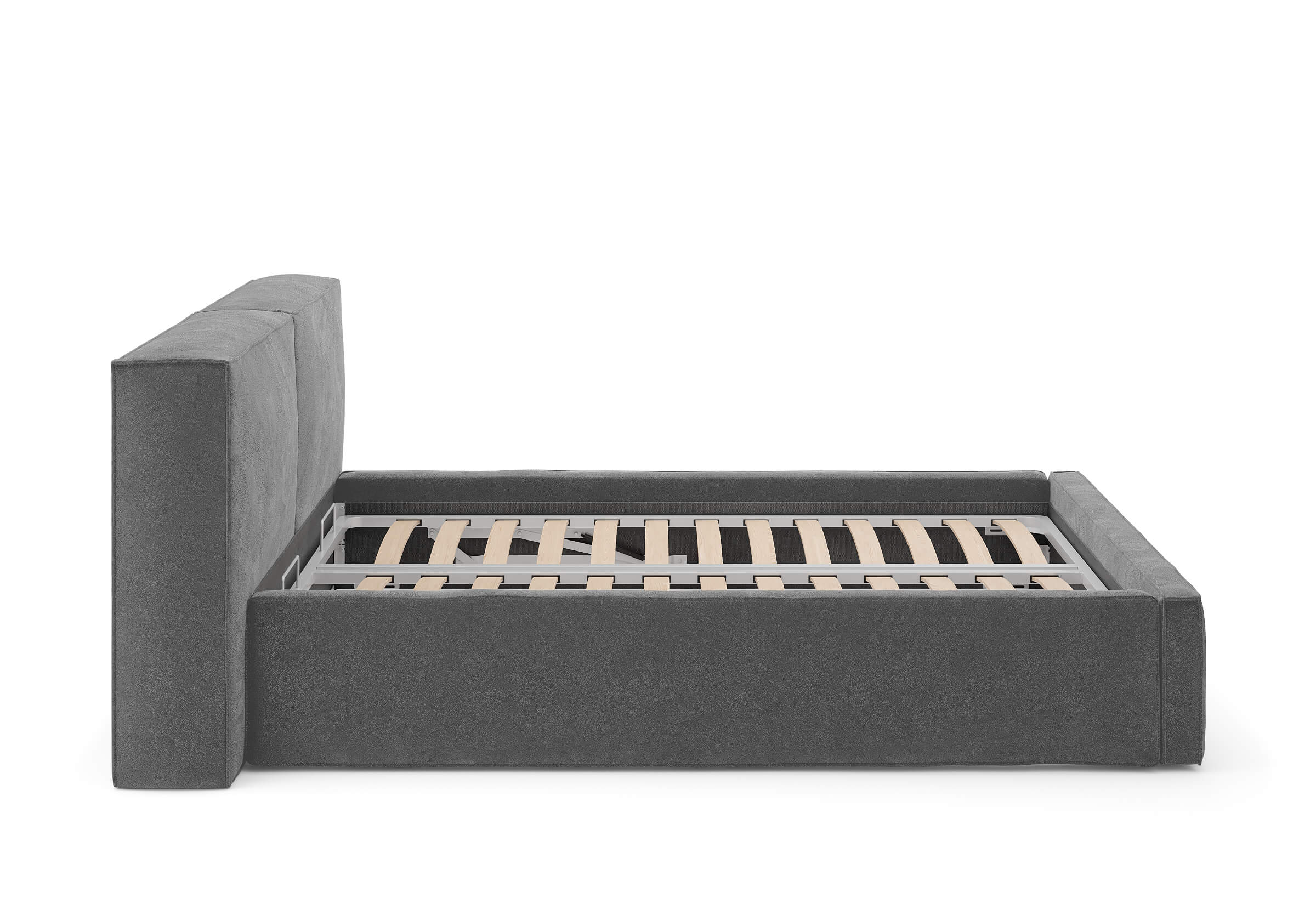 Спинка выполнена в виде двух объемных подушек. Широкие царги опущены до пола, а декоративный кант подчеркивает строгость и брутальность. Увеличенная прочность достигается за счет внутреннего металлического каркаса по периметру кровати. При необходимости кровать может быть укомплектована разборным или неразборным металлическим основанием с ламелями, подъемным механизмом с бельевым ящиком, трансформируемым основанием Aquarius (размером 160-200).