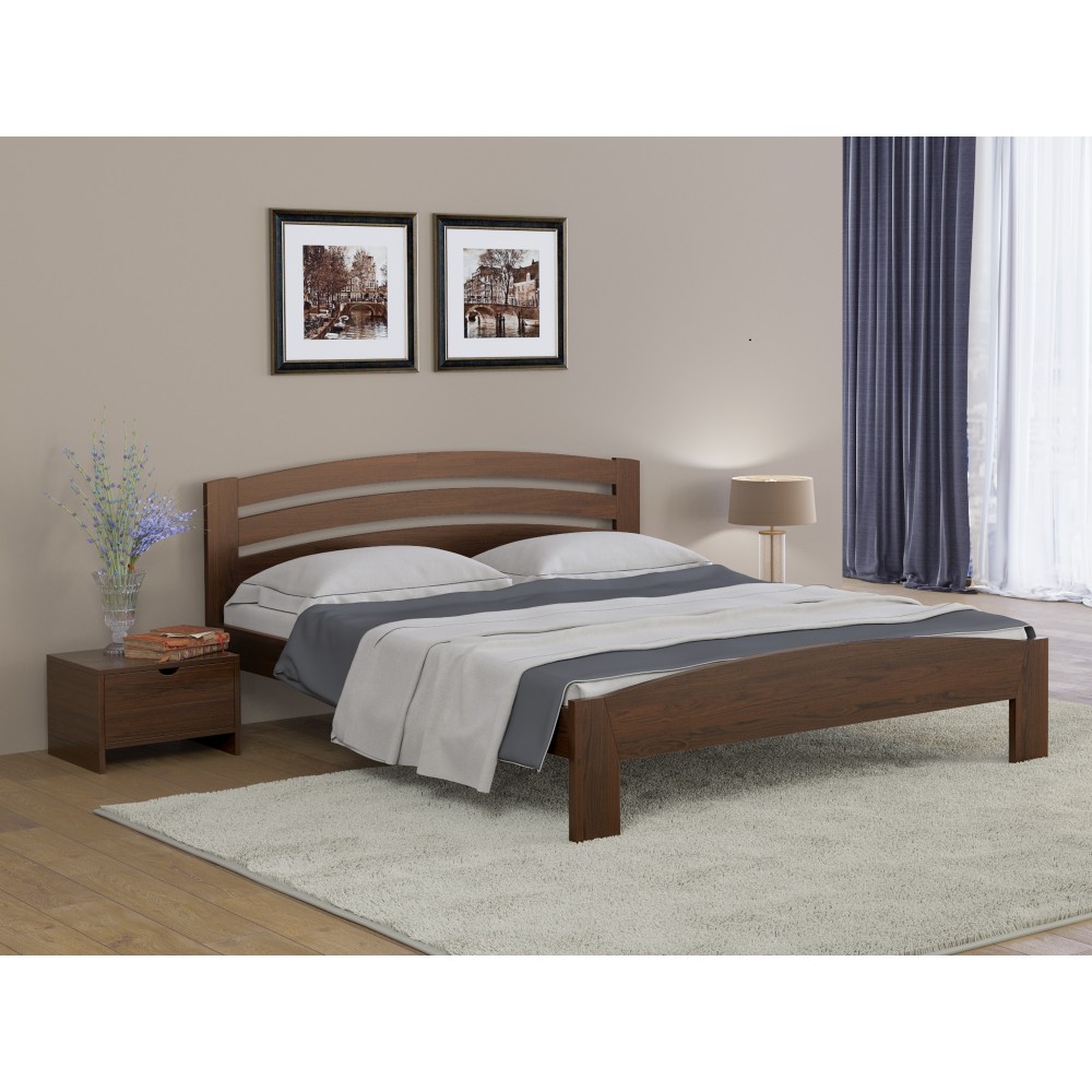 Современная кровать с изголовьем, украшенным декоративной резкой, выполненная в современном стиле.