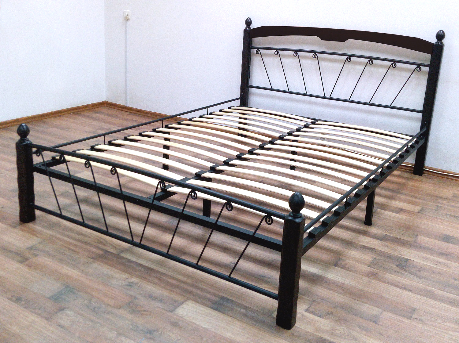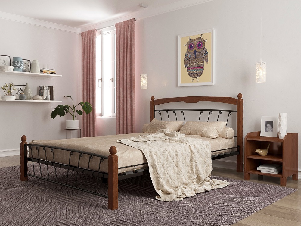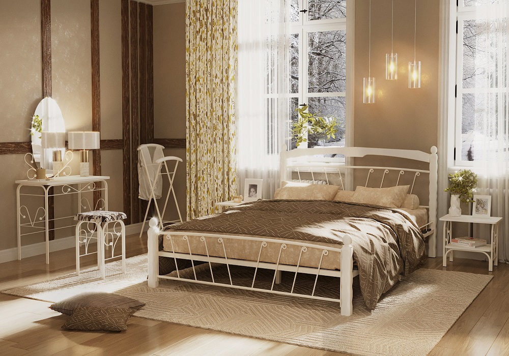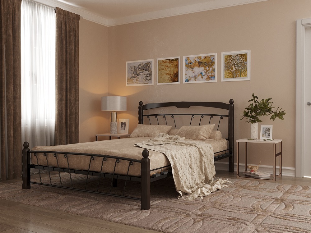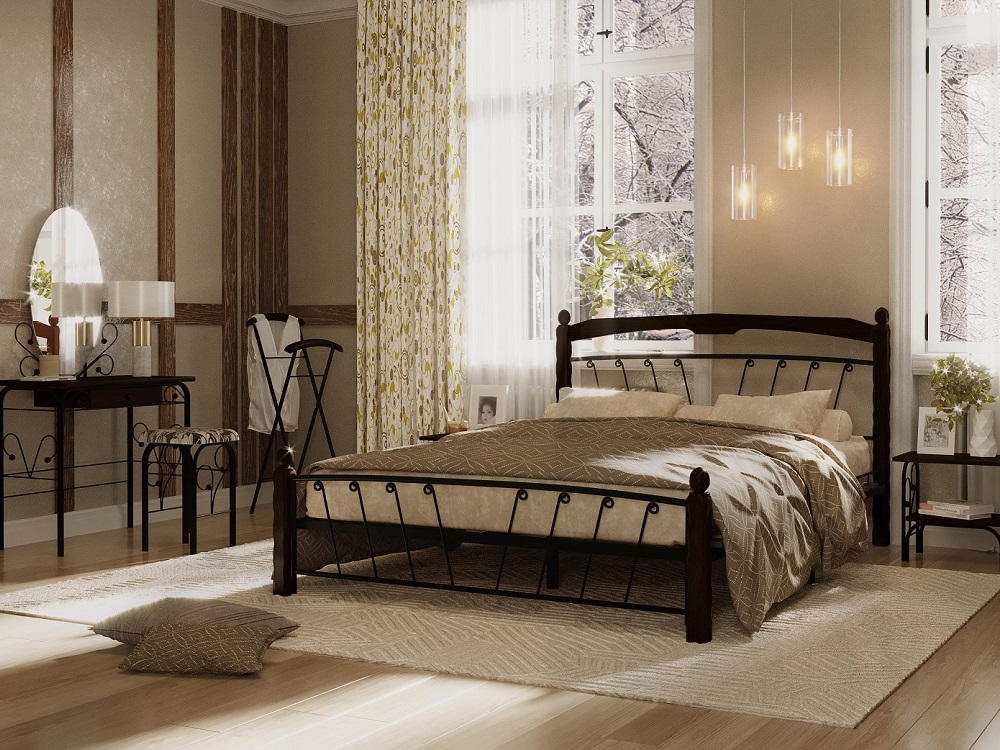 Кровать «Муза 1» с элементами ковки. Ножки кровати изготовлены из массива березы, спинка и изножье декорированы фигурными металлическими элементами. Металлические кровати отличаются надежностью. Комплектуется основанием из березовых ламелей. Кровать будет превосходно смотреться не только в интерьере городской квартиры, но также в спальне загородного дома или дачи.
