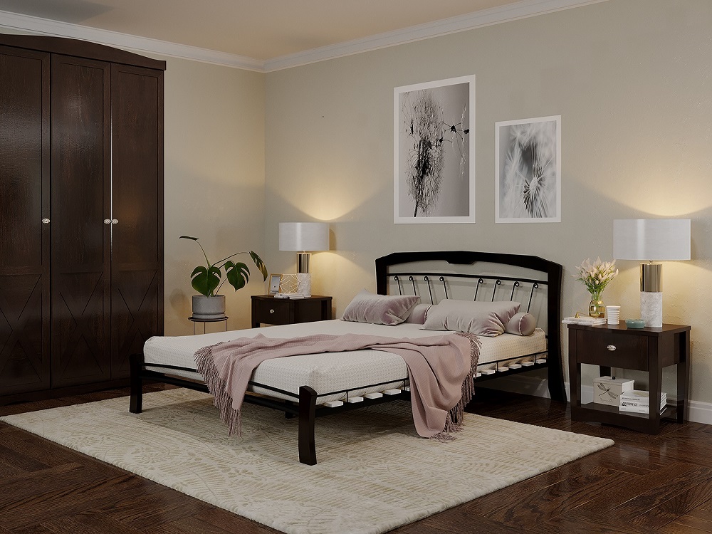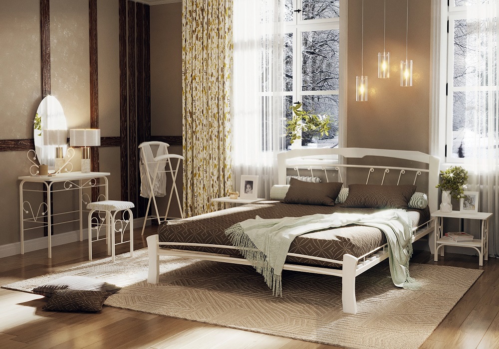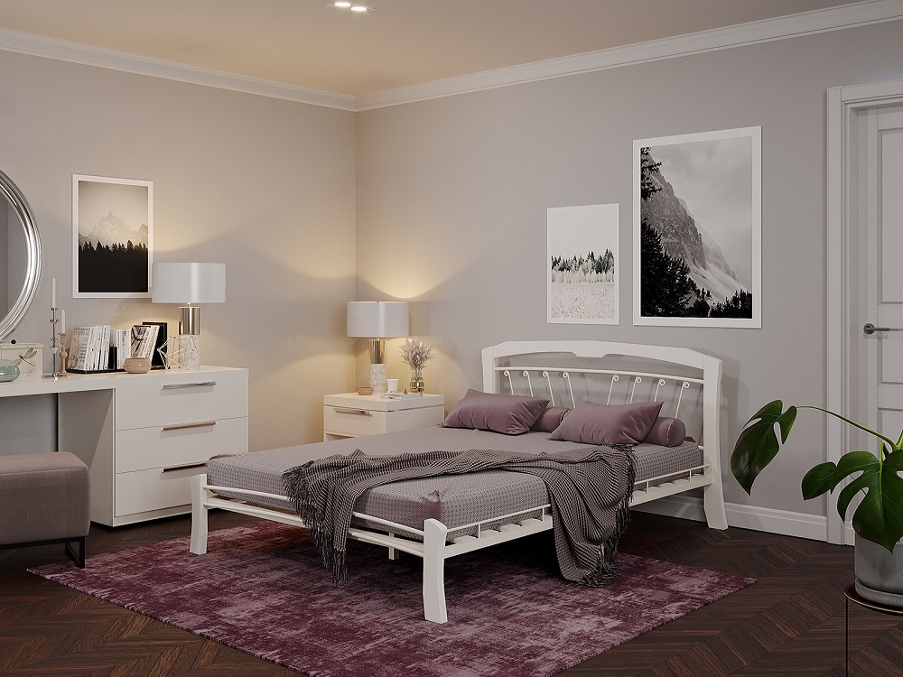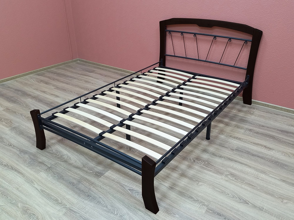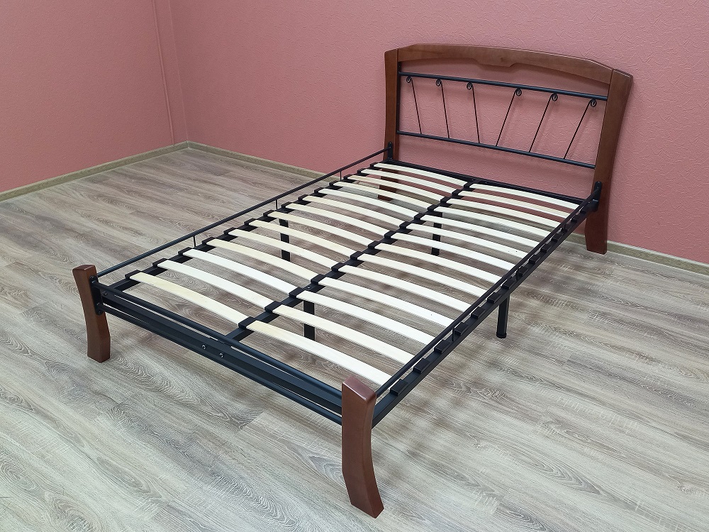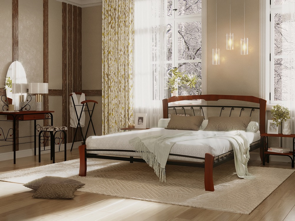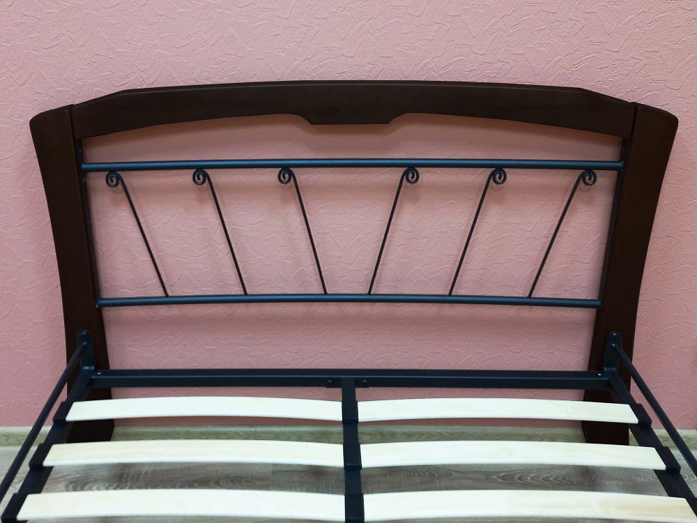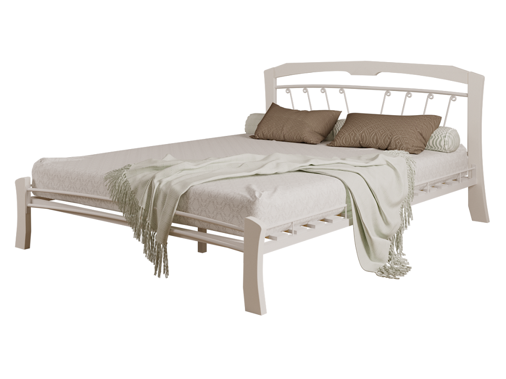 Кровать «Муза 4 лайт» с элементами ковки. Ножки кровати изготовлены из массива березы, спинка и изножье декорированы фигурными металлическими элементами. Металлические кровати отличаются надежностью. Комплектуется основанием из березовых ламелей. Кровать будет превосходно смотреться не только в интерьере городской квартиры, но также в спальне загородного дома или дачи.
