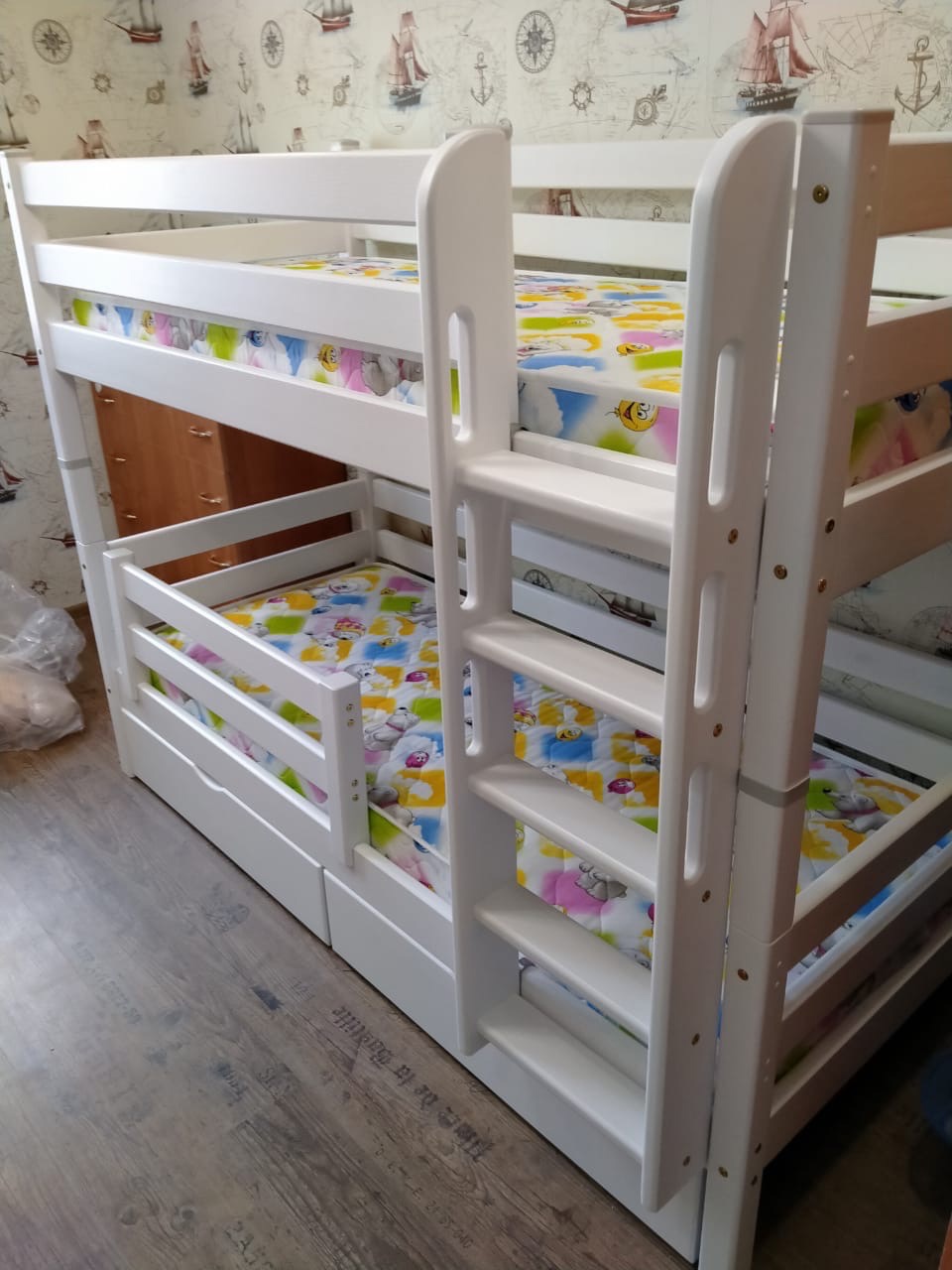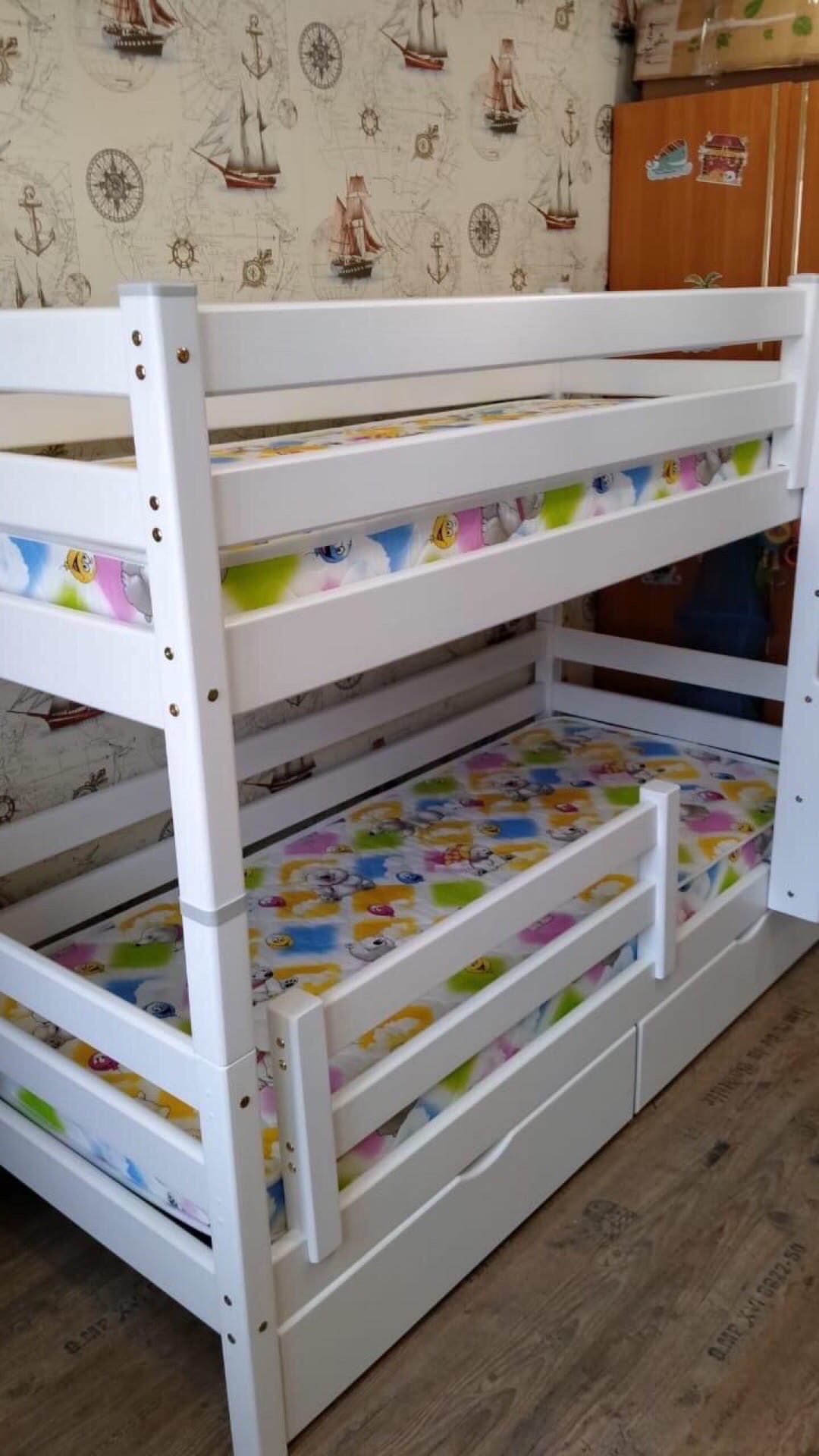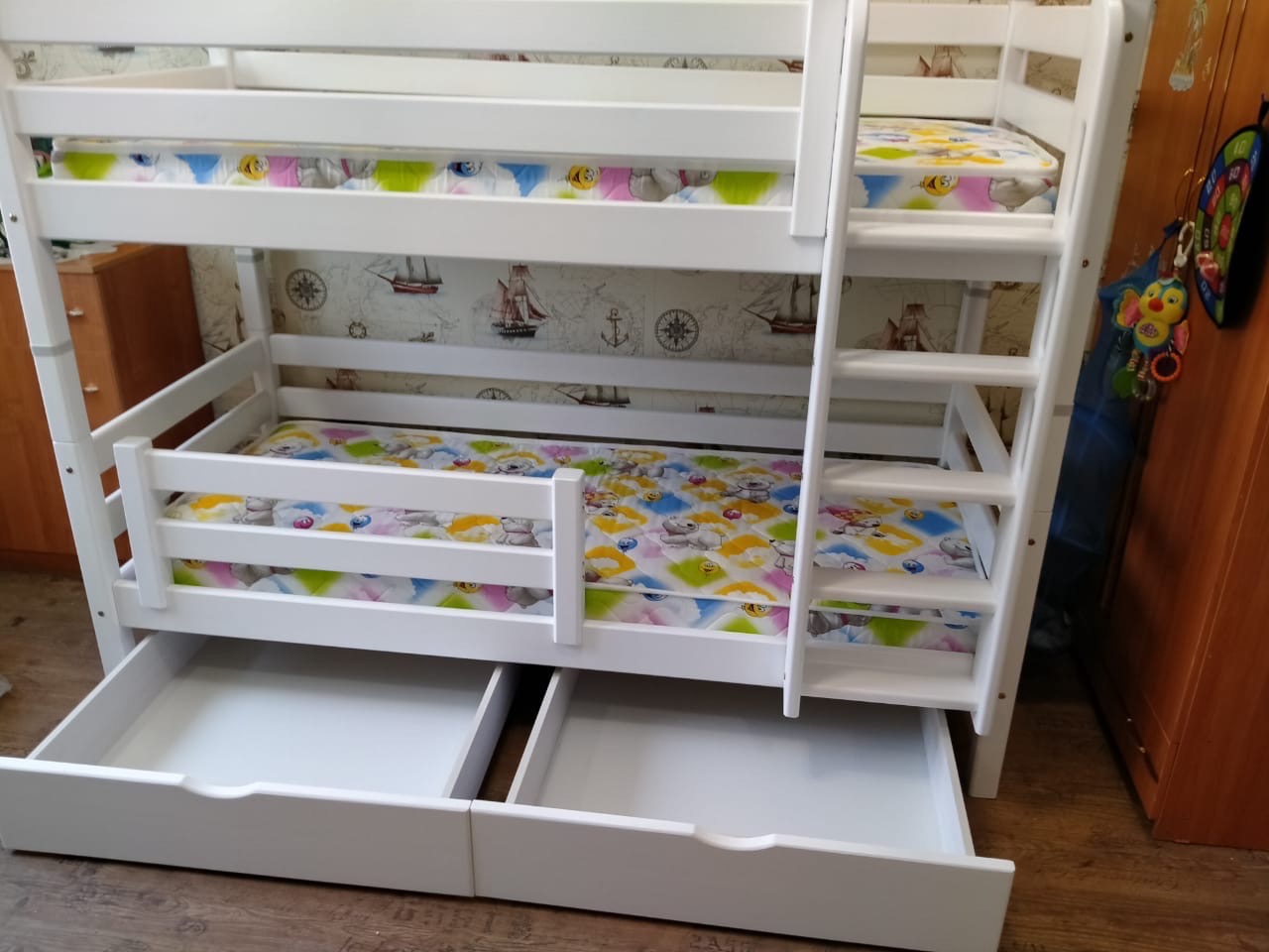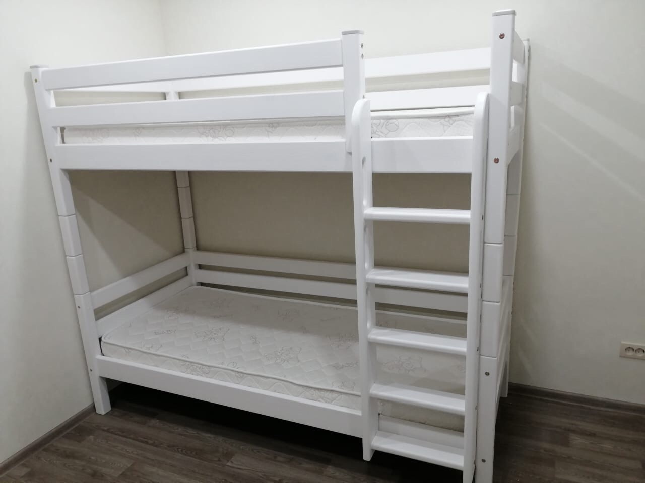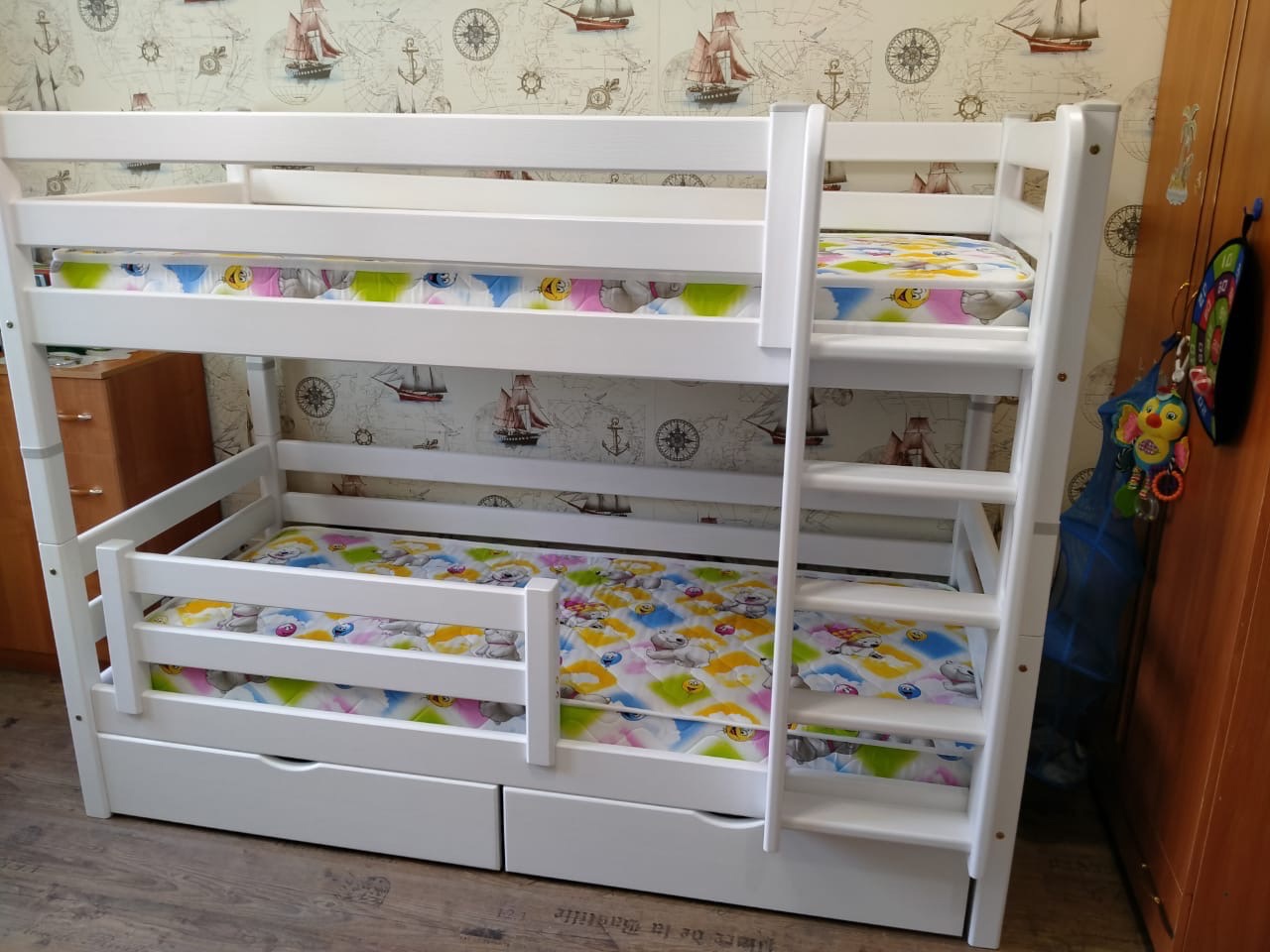 Комплектация детской двухъярусной кроватки Соня NEW-9. В комплект входит каркас 2 кроватей, набор ламелей для основания, защита от падения по периметру 2-ого яруса, опоры и прямая лестница. Каркас выполнен из сосны, а ламели из березы. Главным преимуществом кроватей Соня NEW является массив сосны. Эта древесина является долговечной, надежной и безопасной для здоровья ребенка. Состав: кровати, ламели, защитные стенки, лестница и опоры.Габаритная высота: 156 см Высота боковины: 11,5 см Просвет от пола до царги: 23 / 111 см (нижний ярус / верхний ярус) Углубление под матрас до царги: 6 см Углубление до верхнего края боковых планок: 39 см Максимальная нагрузка: до 90 кг Гарантия: 18 месяцев Срок службы: 10 лет Дополнительно кровать комплектуется съемным бортиком 1- ого яруса, выкатными ящиками и задней защитой 1-ого яруса.