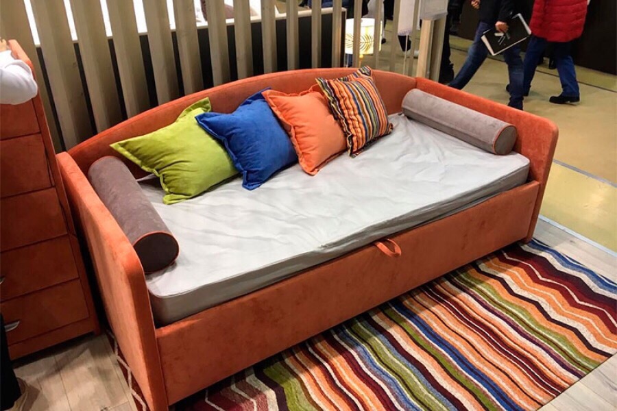 - Модель изготовлена из МДФ и бруса березы. Обивка кровати имеет более 60 вариантов цветового исполнения: из эко-кожи, глазго, велюра и вельвета, микровелюра, шинила, энигмы. Обратная сторона изголовья обита спандбондом, но при желании, её можно выполнить из основного обивочного материала.