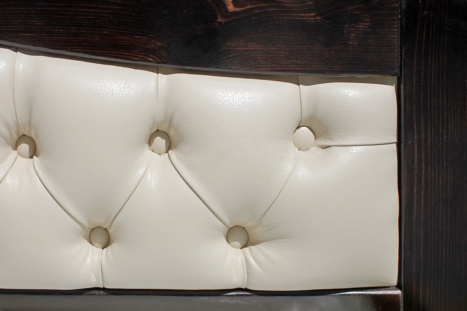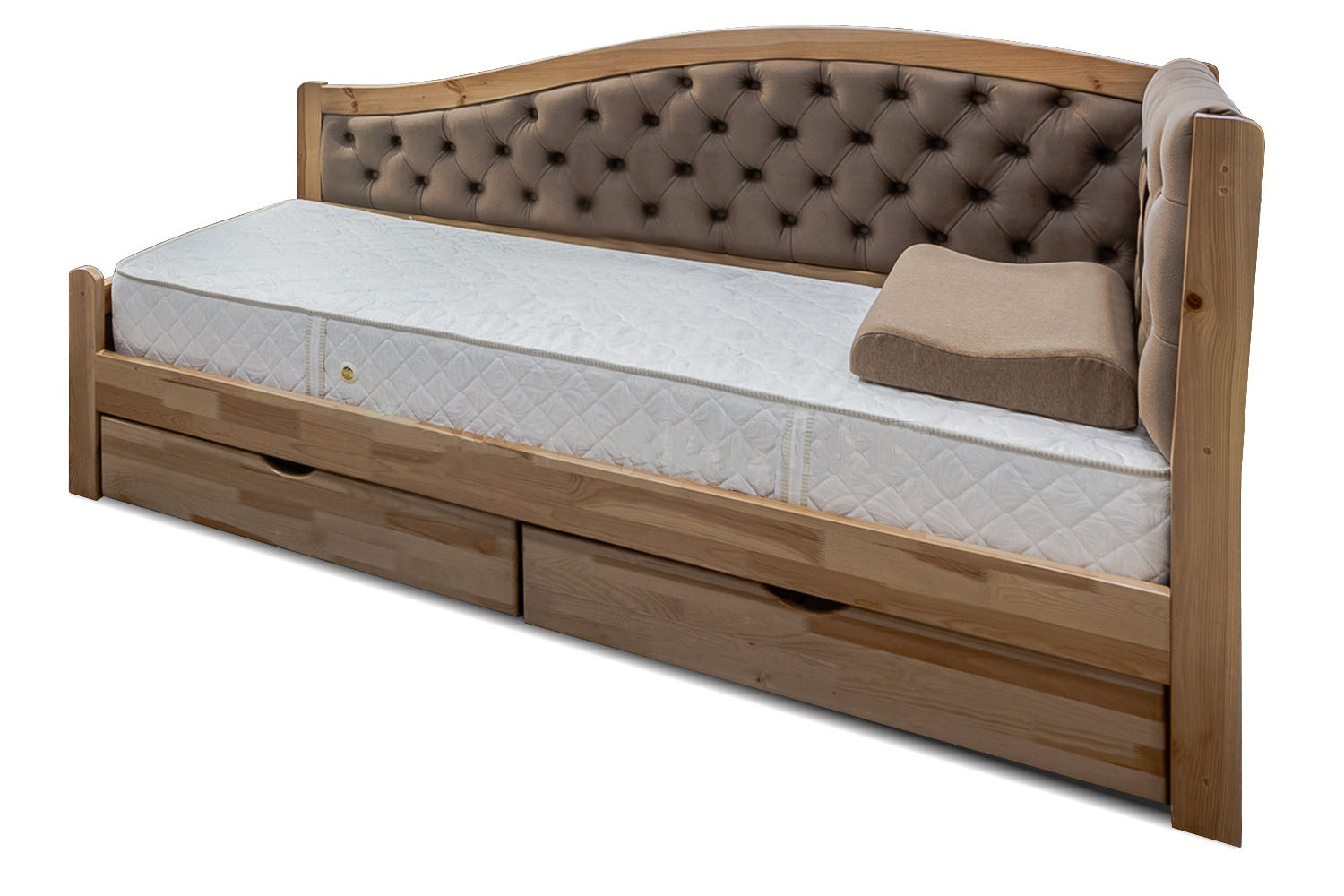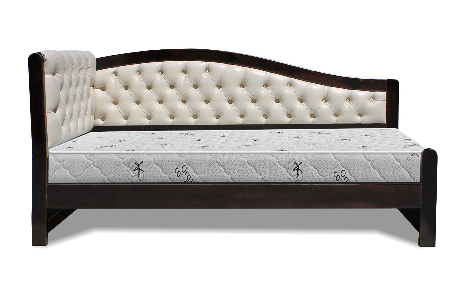 Кровать Вероника Soft-М изготовлена из уникального природного материала – сосны, что обеспечивает целый комплекс положительных свойств: долговечность, способность противостоять воздействию влаги и резким колебаниям температуры, эстетическая привлекательность. Эта древесина абсолютно безопасна для здоровья, что особенно важно в случае с меблировкой для спальни. Конструкция максимально лаконичная и четкая, углы закруглены. Модель характеризует изголовье при отсутствии изножья и изогнутая боковая спинка. Популярный и актуальный способ декора – каретная стяжка обеспечивает простоту ухода и полный комфорт во время отдыха.