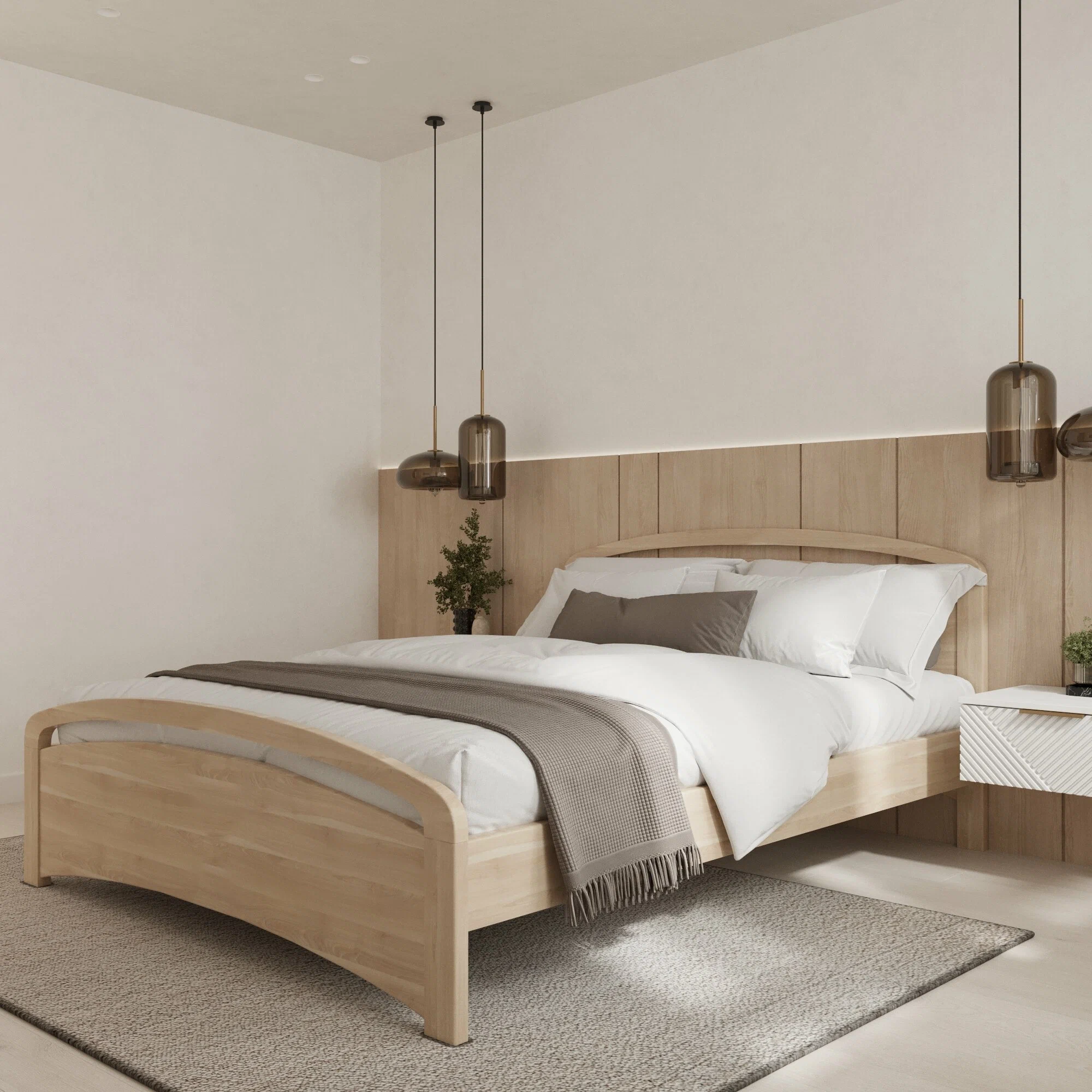 Современная кровать с изголовьем, украшенным декоративной резкой, выполненная в современном стиле.