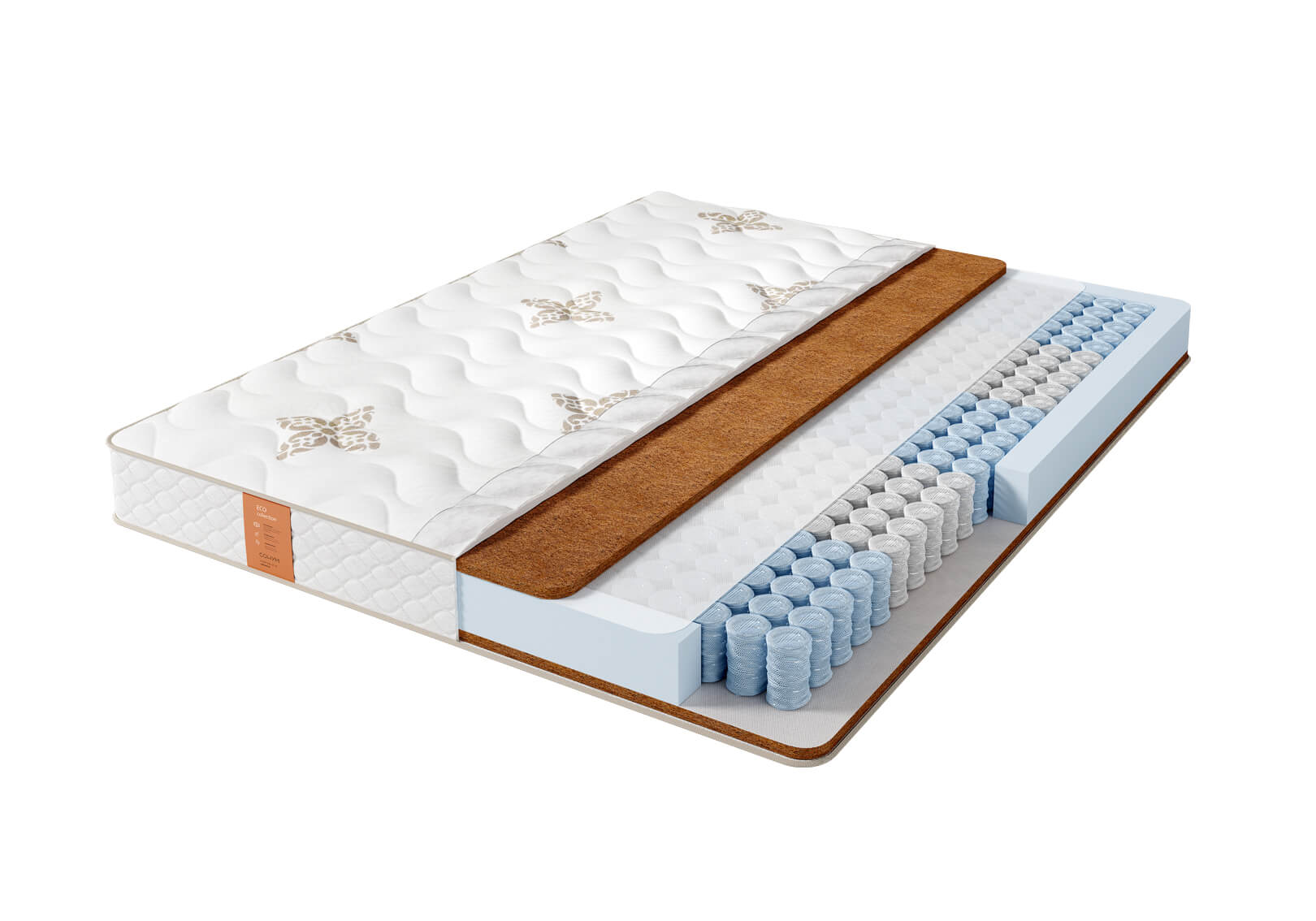 Матрас с кокосовой койрой на базе блока независимых пружин Pocket Zone, имеющий 5 зон различной степени упругости плотностью 500 пружин на спальное место. Благодаря использованию проволоки различного диаметра каждая из зон получает опору соответствующей для нее жесткости, обеспечивая правильное распределение нагрузки. В качестве наполнителя мягкого слоя используется натуральная кокосовая койра. Матрас с кокосовой койрой один из самых жестких в нашем каталоге. Чехол выполнен из высококачественного трикотажа, простеганного на объемном гипоаллергенном синтепоне. Возможно также исполнение чехла в хлопковом жаккарде.