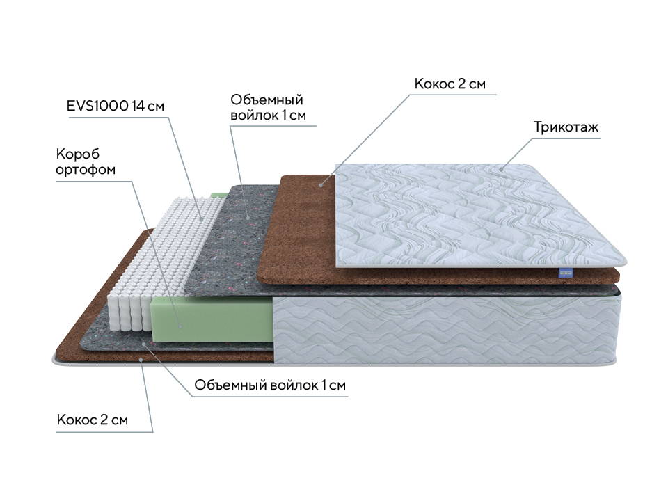 Матрас высокой жесткости с наполнителем на основе натурального кокосового волокна. Надежную поддержку позвоночника обеспечивает усиленный блок независимых пружин, который подстраивается под изгибы тела.