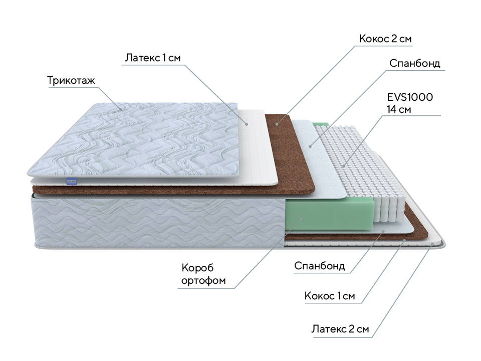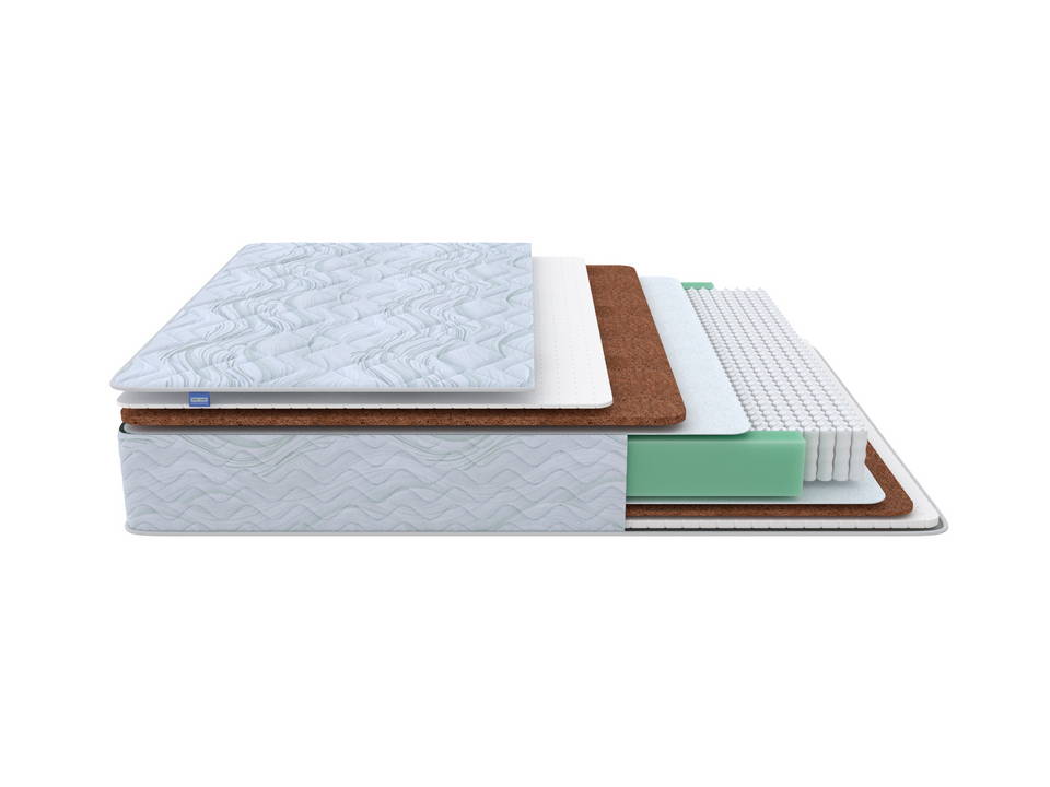 Комфортный слой выполненный из натурального латекса и кокосовой корый придает матрасу комфортную среднюю жесткость. Поддержку позвоночника обеспечивает блок из 1000 независимых пружин, который подстраивается под изгибы тела и служит надежной опорой.
