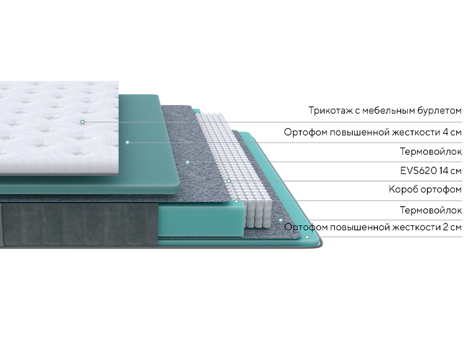 Анатомическая система поддержки позвоночника позволяет матрасу точечно реагировать на вес и контуры тела, правильно распределять нагрузку, разгружая мышцы во время сна. Плотная структура Ортофом в комфортных слоях выдерживает большие нагрузки и быстро восстанавливает форму.