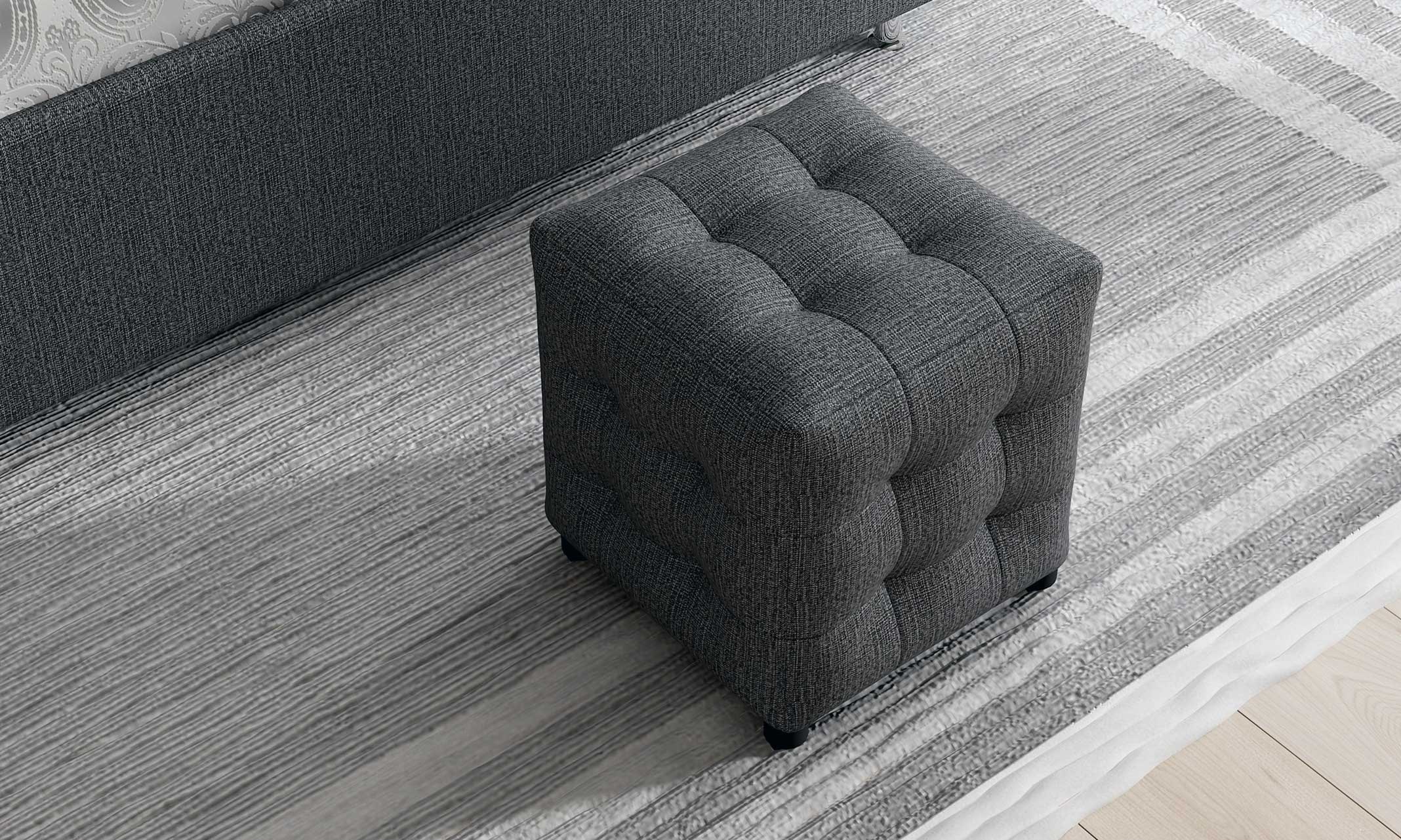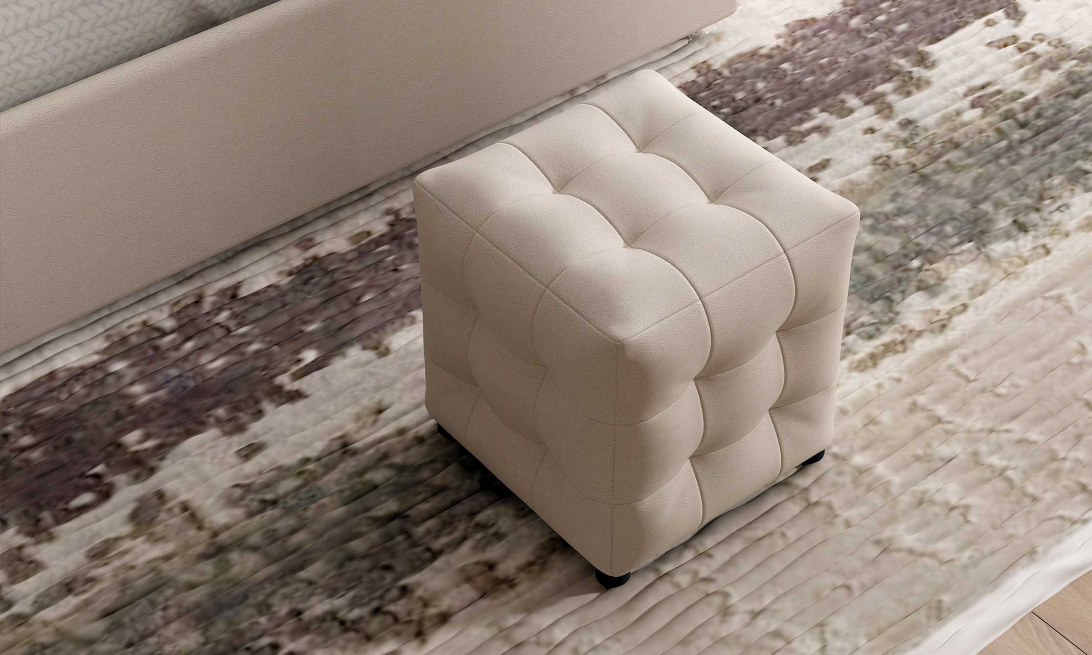 Стильный и удобный пуф. Корпус выполнен из ДСП и МДФ. Со всех сторон пуф покрыт обивочным материалом. Дополнит любую кровать из нашей коллекции.