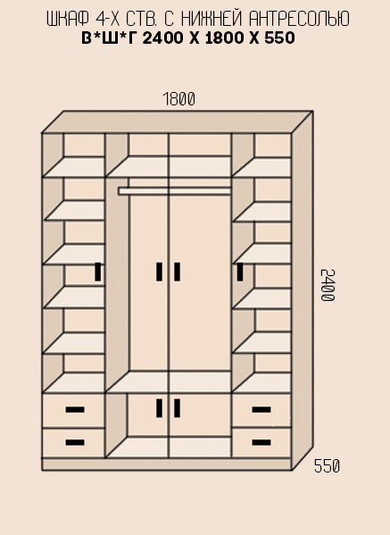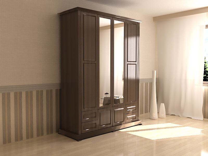 Сияние, блеск, изысканность и элегантность – все эти слова непосредственно связаны с внешним видом данной модели шкафа. Такой шкаф не только сам по себе выглядит дорого и шикарно, но и способен создать такую же атмосферу в окружающем интерьере. Для совершенного гармоничного сочетания шкафа с интерьером, желательно, чтобы он имел приближенные спокойные и теплые оттенки, как и в покрытии шкафа. Сияние шкафа дополнено таким незаменимым дополнением, как зеркала, которые полностью покрывают распашные двери отделения для подвешивания одежды. Шкаф не имел бы такой превосходный эксклюзивный вид без резных фигур и линий сделанных на его поверхности.
