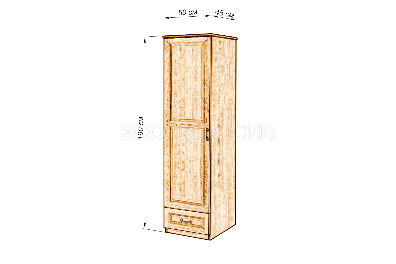 Одностворчатый шкаф ЕСО-17 может исполнять роль дополнительного элемента к гарнитуру или самостоятельного предмета мебели. Скромные размеры, но солидный вид позволяют использовать ЕСО-17 в комнате любого назначения. Это может быть детская, спальня, гостиная и даже прихожая. Дизайнерская идея совместить во внешнем виде этого предмета мебели современный стиль и классику придает ему некий шарм, особенность и неповторимость. Также очень удобен ЕСО-17 наличием выдвижного ящика внизу. Этот элемент оценят по достоинству хозяйки дома, стремящиеся к порядку. Материал: Сосна — щит мебельный сращенный (класс Экстра), задняя стенка: ламинированная ДВП. Покрытие: Полиуретановые и акриловые ЛКМ фирмы TECHNOcolor, они характеризуются большим разнообразием и являются наиболее популярными на сегодняшний день, обеспечивают отличное качество поверхности, высокую износоустойчивость, позволяют дольше сохранить внешний вид изделия. Фурнитура: Мебельные петли с обратной пружиной BOYARD PUSH Slide-On совместно с магнитным толкателем. Именно толкатель позволяет открывать фасад от легкого нажатия и фиксировать его в закрытом состоянии с помощью магнитного наконечника.