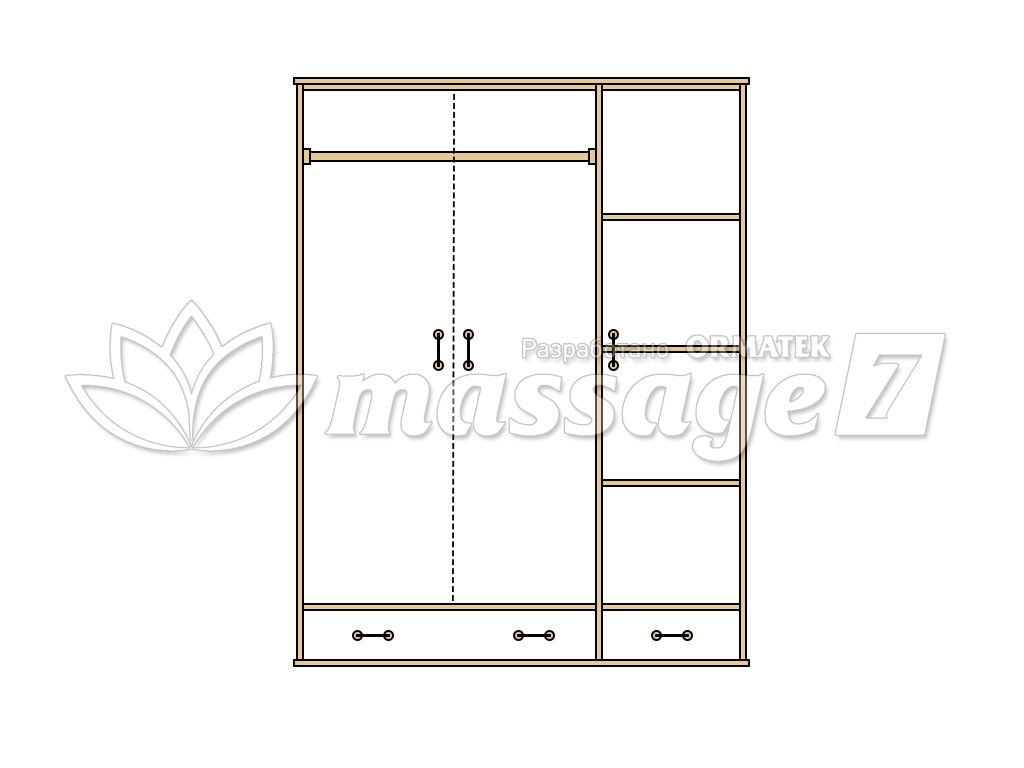 Дизайн трехстворчатого шкафа ЕСО-20 является сдержанным и простым, однако это вовсе не умоляет его функциональные качества. Такой предмет мебели придется по вкусу ценителям минимализма. Единственный декор – это неглубокая фрезеровка по периметру створок. Фасад же выдвижных ящиков остается нетронутым. Изюминку во внешний вид ЕСО-20 вносят три пары резных ножек, придающих мебели классический оттенок. Внутреннее наполнение шкафа делится на два отдела: отсек для тремпелей и закрытые полки. Дополнительные ящики внизу разного размера и исполнят роль небольшого комода.
