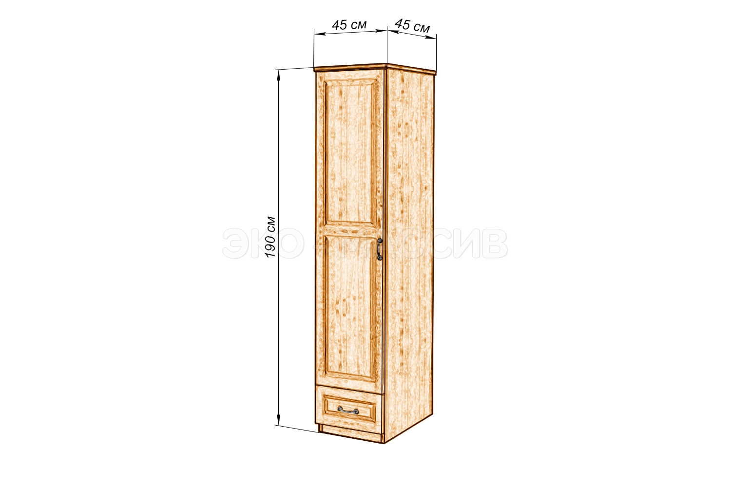 Шкаф ЕСО-22 миниатюрный и очаровательный в своем исполнении. Его минимальную ширину и глубину можно использовать в очень тесном помещении. А также этот предмет мебели может служить дополнительным элементом к уже имеющемуся гарнитуру. Фасад шкафа приправлен незамысловатым геометрическим орнаментом в виде трех прямоугольников, которые хорошо подчеркивают строгость линий корпуса. Зато резные ножки и фигурное основание ЕСО-22 вырываются из общего вида мебельного предмета своим классическим оттенком, что обеспечивает его дизайну оригинальность и самобытность. Материал: Сосна — щит мебельный сращенный (класс Экстра), задняя стенка: ламинированная ДВП. Покрытие: Полиуретановые и акриловые ЛКМ фирмы TECHNOcolor, они характеризуются большим разнообразием и являются наиболее популярными на сегодняшний день, обеспечивают отличное качество поверхности, высокую износоустойчивость, позволяют дольше сохранить внешний вид изделия. Фурнитура: Мебельные петли с обратной пружиной BOYARD PUSH Slide-On совместно с магнитным толкателем. Именно толкатель позволяет открывать фасад от легкого нажатия и фиксировать его в закрытом состоянии с помощью магнитного наконечника.
