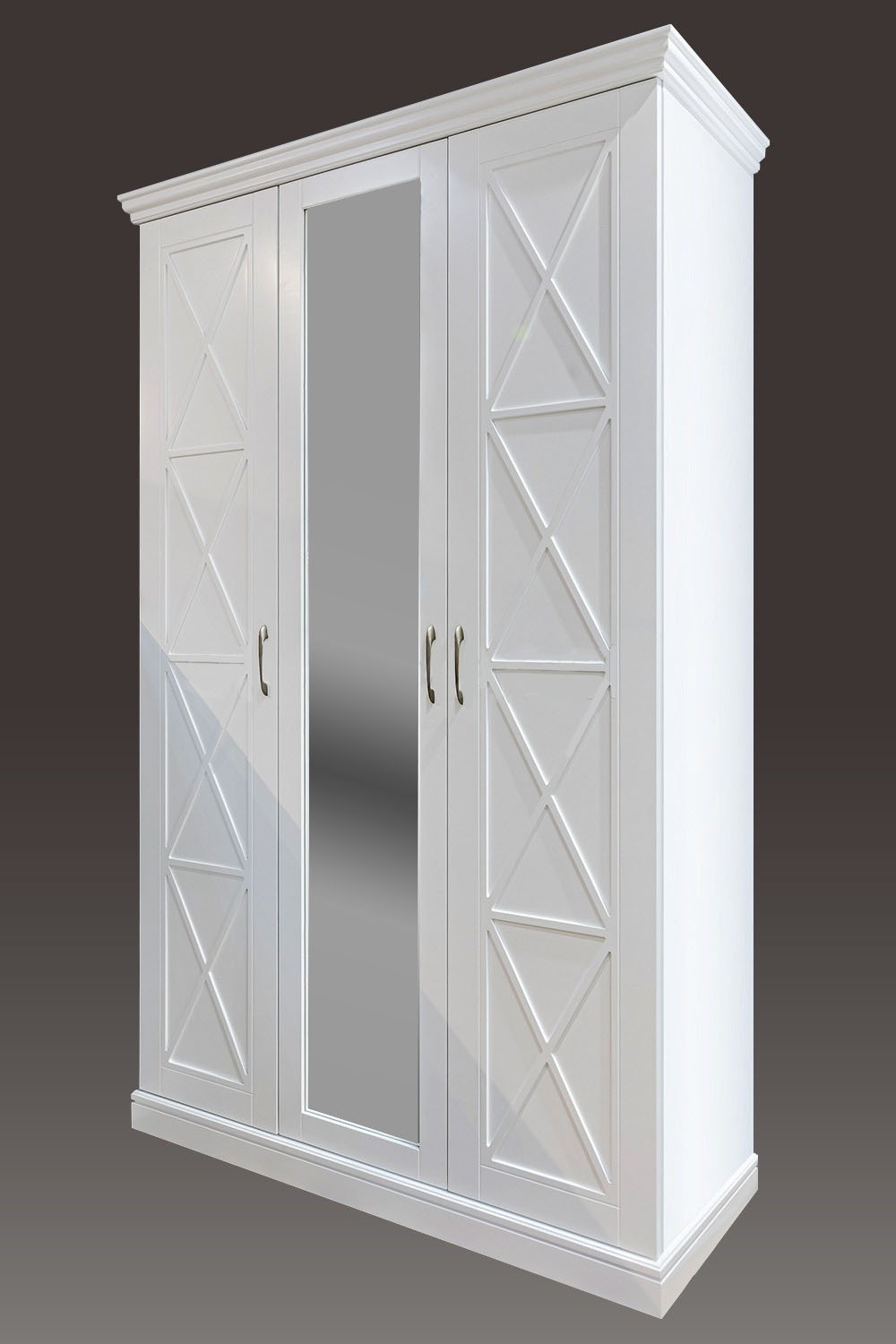 Шкаф Леруа – трехстворчатая модель с большой вместительностью и привлекательным дизайном. Он выглядит выигрышно на фоне конкурентов за счет интересного узора и наличия функционально-декоративного зеркала в центральной части. Внутри корпуса изделия находятся шесть малых и одна большая полка, отсек с перекладиной под плечики, а также отделение для обуви. Изготовлен шкаф из массива дерева, поэтому он способен прослужить долгие годы без особых условий ухода.