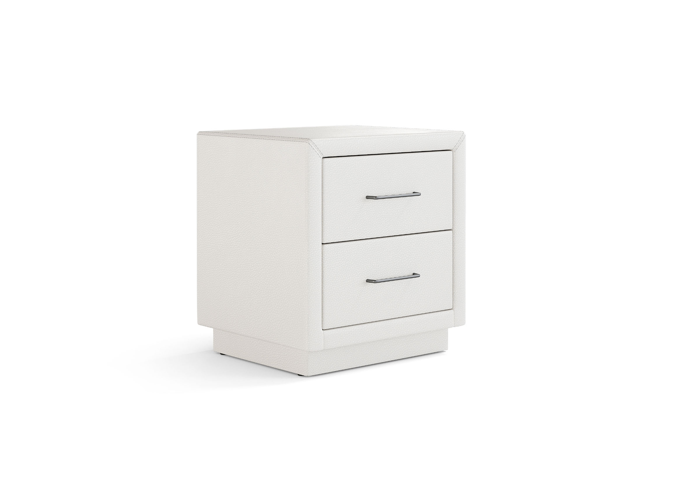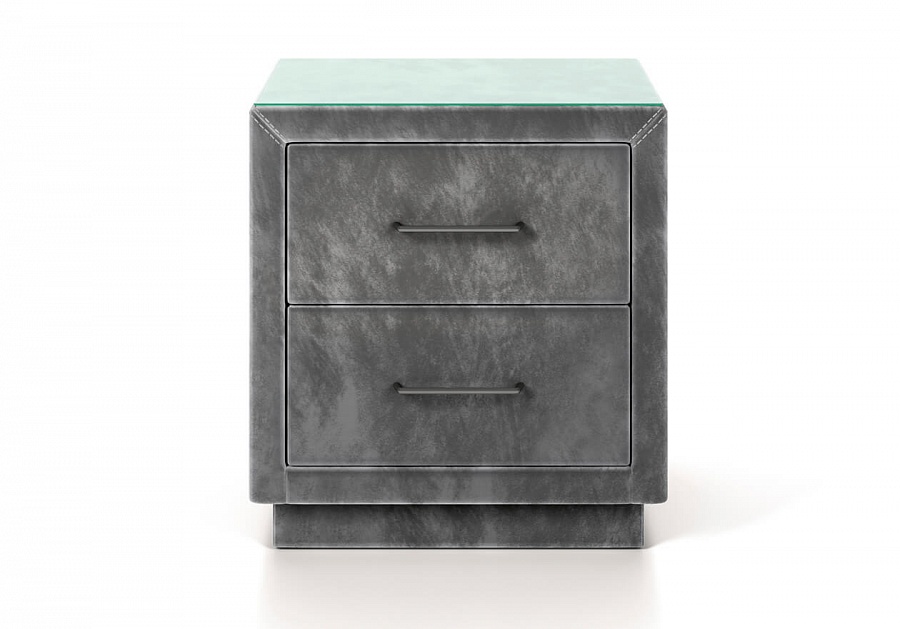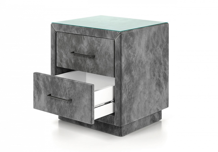 Прикроватная тумба с двумя выдвижными ящиками сочетается с любыми моделями кроватей, органично вписывается в интерьер практически любого стиля. Каркас тумбы выполнен из ДСП. Каркас тумбы и фасад ящиков покрыты обивочным материалом. Для удобства использования и продления срока эксплуатации, рекомендуется использовать стеклянную накладку. Накладка используется в качестве столешницы для тумбы и защищает ее от повреждений и загрязнений