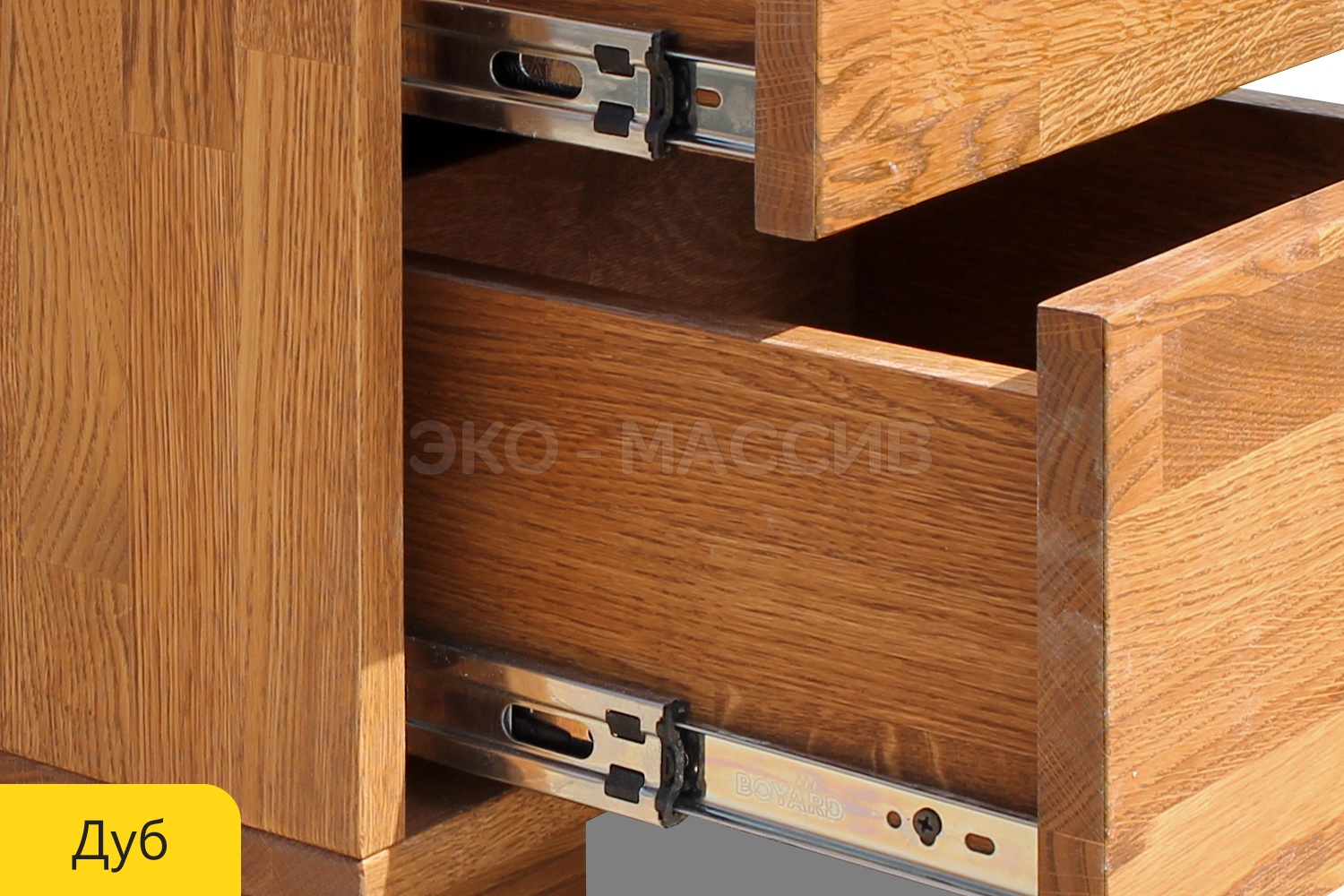 Тумба выполнена с новой системой открывания фасадов, а именно с нажимным механизмом push-to-open фирмы BOYARD. Направляющие push-to-open придают больше удобства и эстетики мебели.