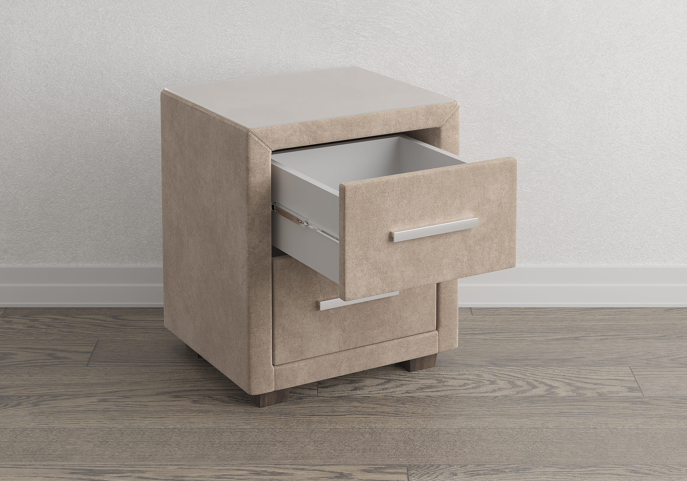 Прикроватная тумба с двумя выдвижными ящиками сочетается с любыми моделями кроватей, органично вписывается в интерьер практически любого стиля. Каркас тумбы выполнен из ДСП. Каркас тумбы и фасад ящиков покрыты обивочным материалом. Для удобства использования и продления срока эксплуатации, рекомендуется использовать стеклянную накладку. Накладка используется в качестве столешницы для тумбы и защищает ее от повреждений и загрязнений