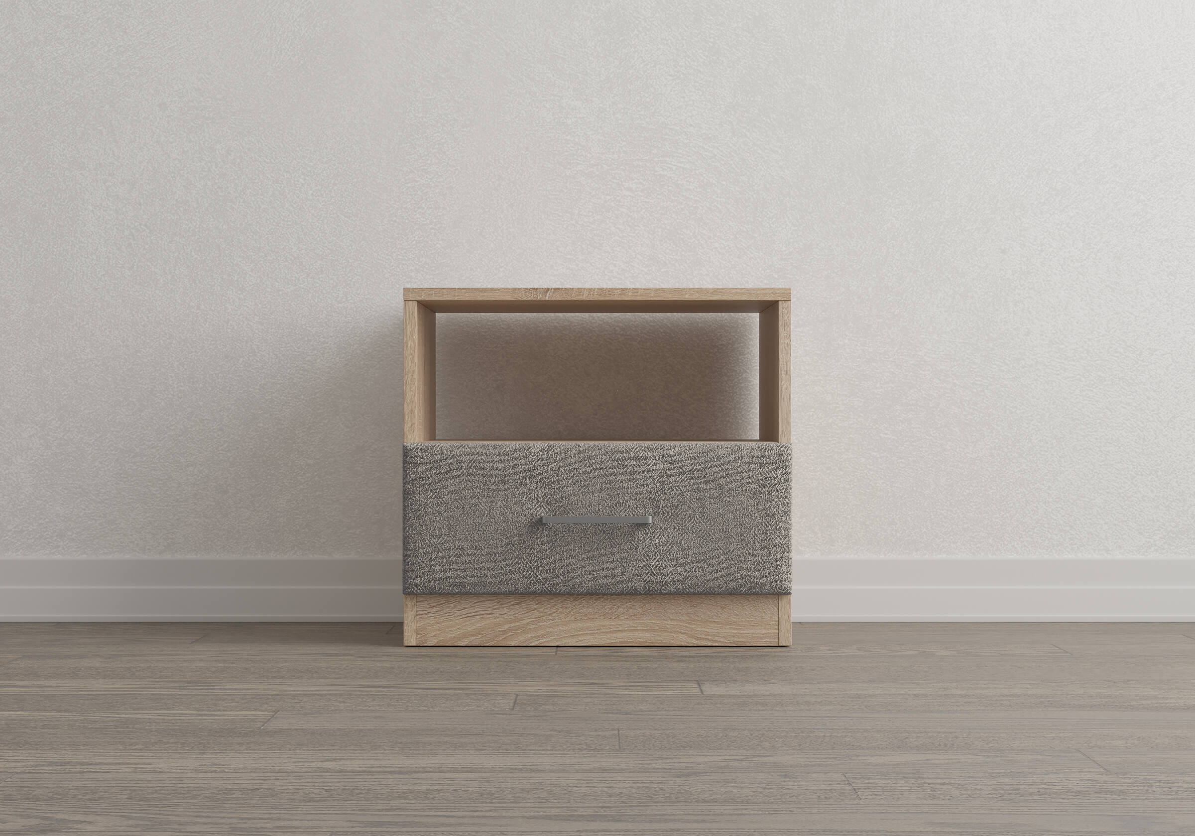 Конструкция тумбы предусматривает два вместительных выдвижных ящика с направляющими скрытого монтажа и доводчиками. Корпус из ЛДСП гарантирует долговечность и устойчивость к механическим повреждениям, а мягкие фасады в ткани и изящные металлические ручки добавят уют.