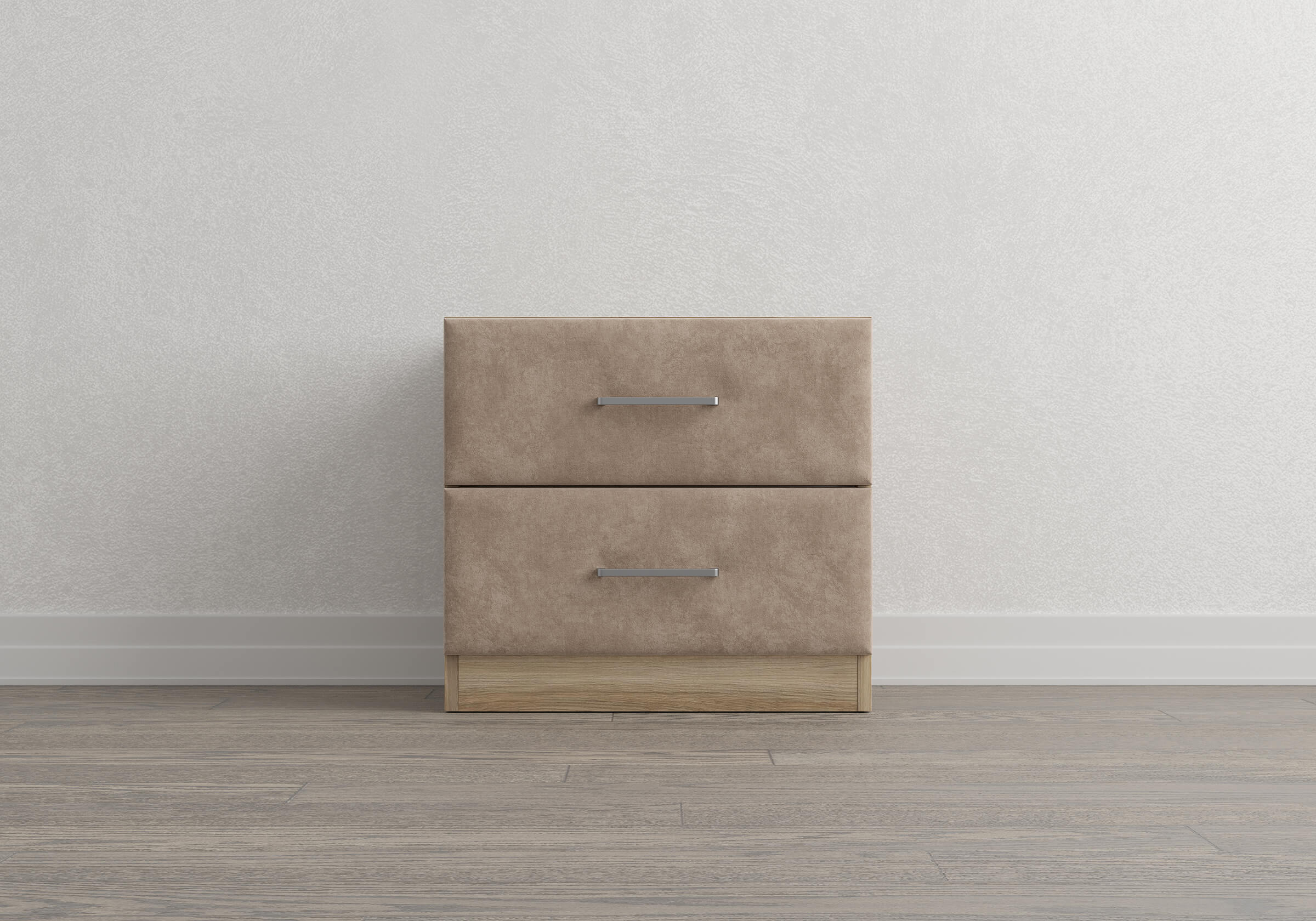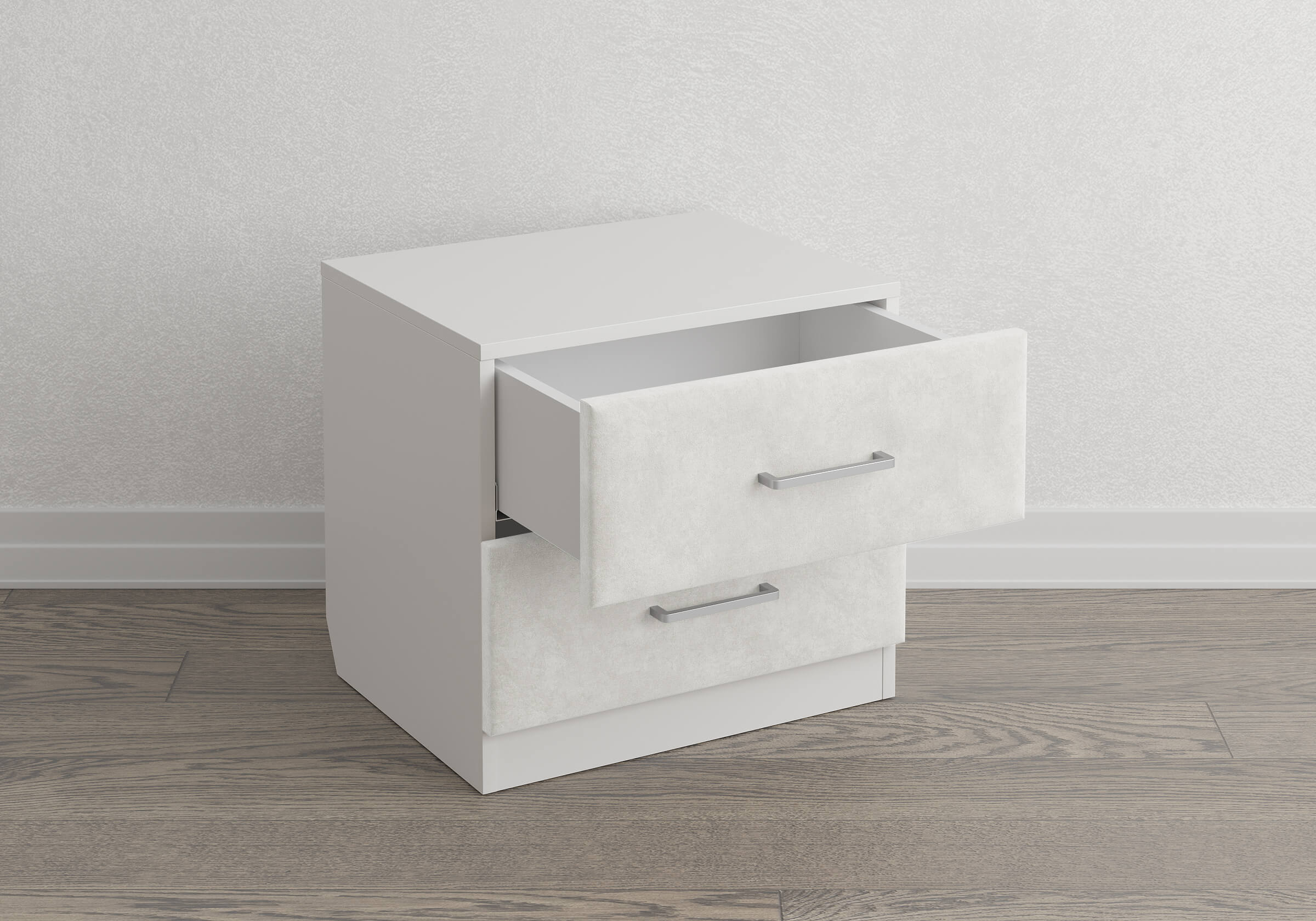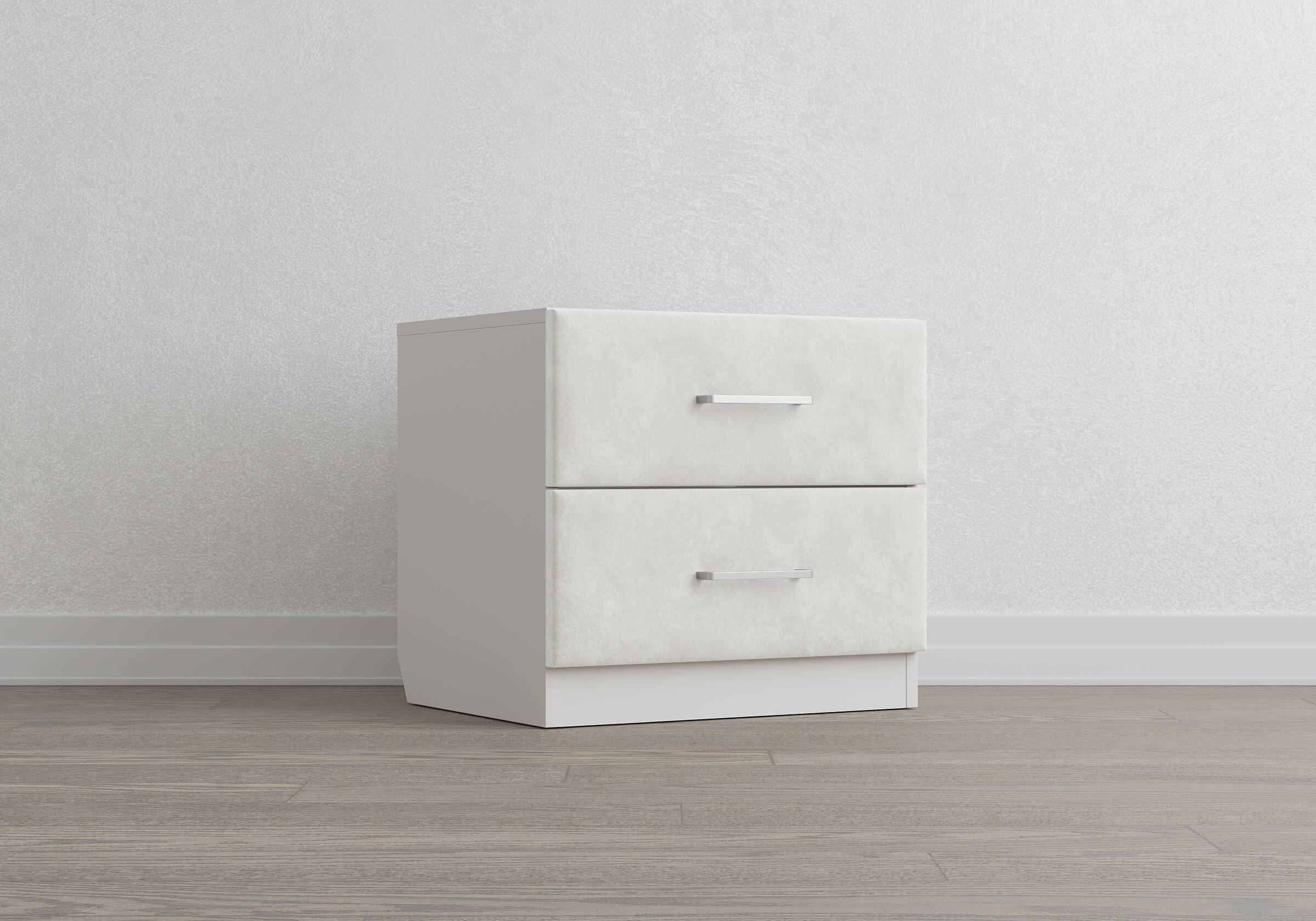 Конструкция тумбы предусматривает два вместительных выдвижных ящика с направляющими скрытого монтажа и доводчиками. Корпус из ЛДСП гарантирует долговечность и устойчивость к механическим повреждениям, а мягкие фасады в ткани и изящные металлические ручки добавят уют.